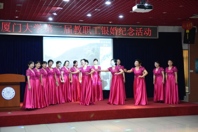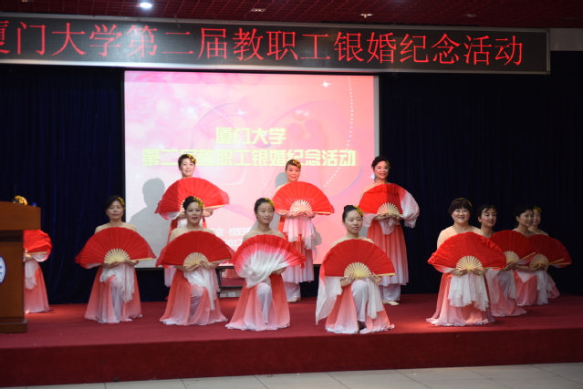 为了共同祝贺这一美好的时刻,厦大教职工子女合唱团、教工艺术团舞蹈队和合唱队分别带来童声合唱《雪花、雪花》、舞蹈《盛世鸿姿》,以及女声合唱《采茶姑娘》。校宣传部楼红英老师、经济学院赖春燎老师、艺术学院的学生代表则分别用爱情诗朗诵《因为风的缘故》、男高音独唱《奇妙的和谐》,以及热情洋溢的伦巴舞,各自为银婚夫妻们送上了最真挚的祝福。