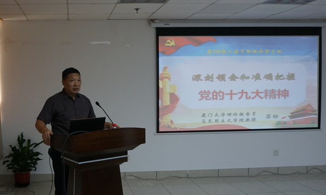 厦门大学理论报告员、马克思主义学院苏劲教授应邀作了《深刻领会和准确把握党的十九大精神》辅导报告,他以新时代、新思想、新征程为章,深入浅出解读进入中国特色社会主义新时代的深远意义、基本内涵、社会主要矛盾变化和习近平新时代中国特色社会主义思想包括的主要内容,详细阐述从全面建成小康社会到基本实现现代化,再到全面建成社会主义现代化强国迈入新征程的战略安排。苏劲教授精辟的讲解加深了大家对党的十九大精神的理解。