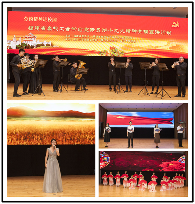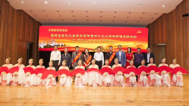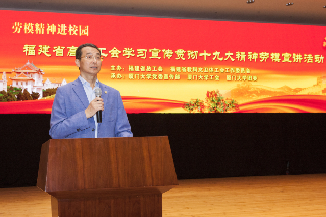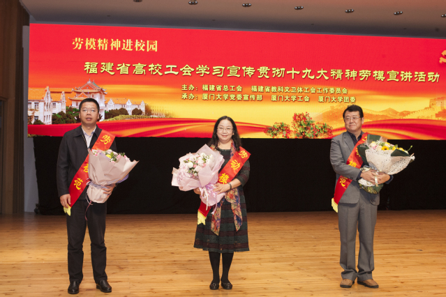 为了深入学习贯彻十九大精神,宣传工匠人才、弘扬劳模精神,11月29日上午,福建省高校工会学习宣传贯彻十九大精神劳模宣讲活动在我校科学艺术中心举行。全国劳动模范、福建省总工会、厦门港务控股集团有限公司工会冯鸿昌副主席,厦门市劳动模范、物理科学与技术学院特聘教授康俊勇教授,厦门市劳动模范、法学院副院长李兰英教授,为现场的五百多名工会干部、师生代表做了场精彩的宣讲报告会。