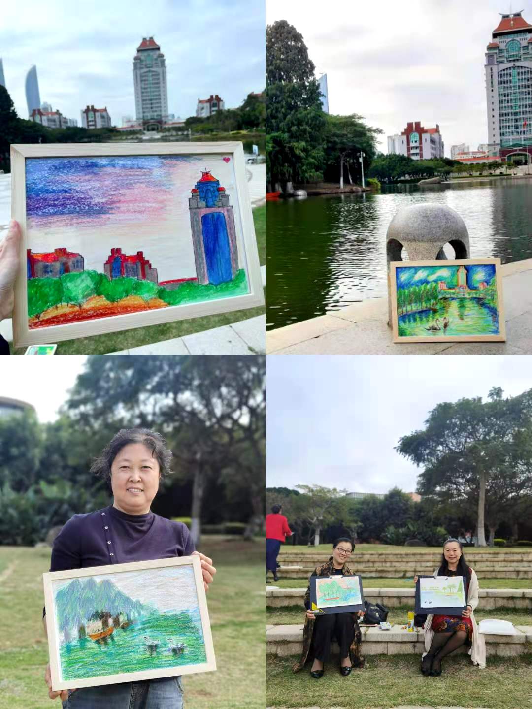 在了解了写生技法后,大家纷纷走出了教室,来到芙蓉湖畔用画笔勾勒多样的厦园风景。湖光山色、美景作陪,大家在舒适愉悦的氛围中挥洒创意、展现精彩。惬意戏水的黑天鹅、随风摇曳的凤凰木、庄严雄伟的颂恩楼……厦园风采跃然纸上。弹指一挥,老师们陆续完成了画作,在把作品装入画框的一刻,大家的欣喜自豪之感油然而生,纷纷拍照留念,定格难忘瞬间。