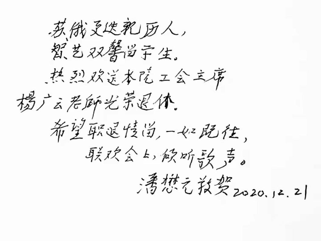 潘懋元先生通过网络在线致辞,他高度肯定了杨老师为研究院做出的突出贡献,认为杨老师为人低调,工作勤勉,是一位好老师、好干部。杨老师虽然荣退,但希望情谊犹在,歌声犹在。先生还亲笔写下了祝福,庆贺杨老师光荣退休。