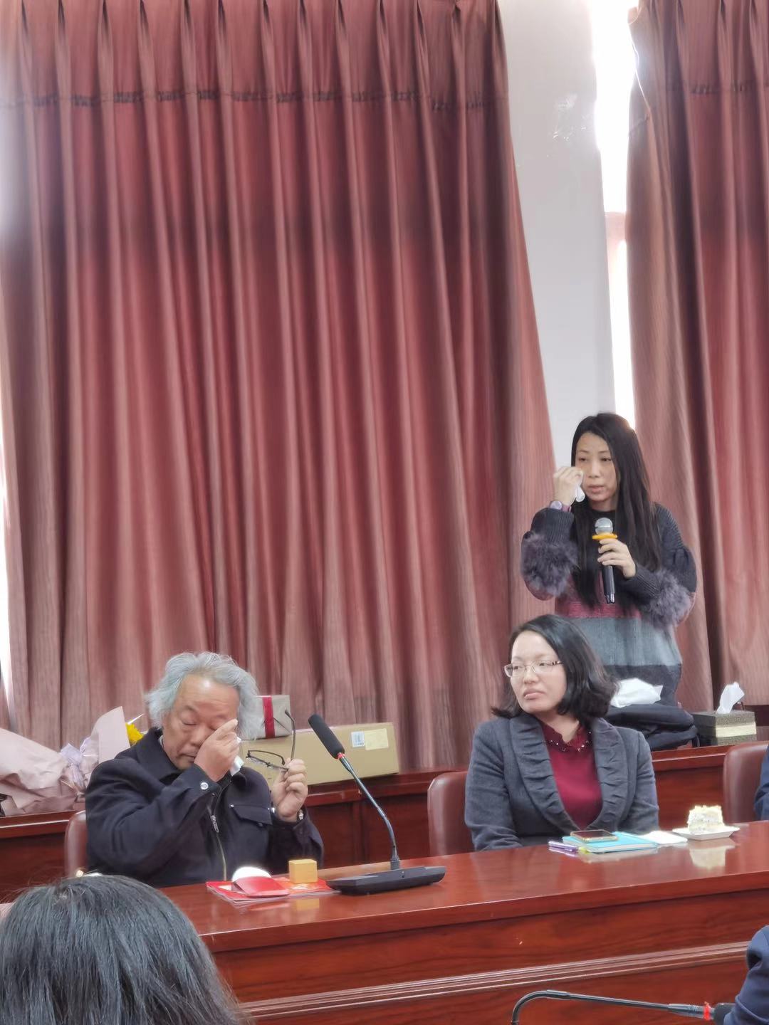 在欢快的音乐声中,党委副书记姚有新与杨老师一同切蛋糕,祝贺他光荣退休。参加荣休仪式的老师和研究生代表纷纷发言,表达了对杨老师的祝福致敬之意,也寓意着薪火相传、继往开来的文化传承,在仪式现场,不少师生数度哽咽,流下感激的泪水。