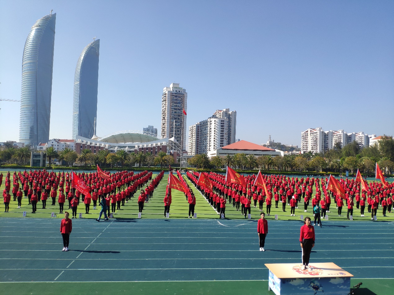 随后,演武场展演了千人练操的大场面。教职工代表齐聚一堂,统一身穿红装,动作整齐划一,精神饱满昂扬,在教练的带领下依次表演工间操、热身操、健身操。天际万里无云,碧空如洗,教职工精彩的展演与学校的独特建筑共同绘就成一幅健身强校的壮美画卷。