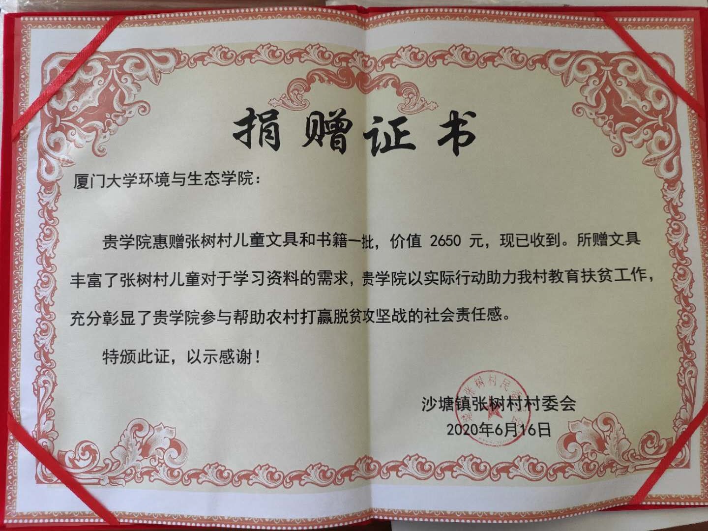 活动上颁发给小朋友的文具等学习用品是来自几千公里以外厦门大学环境与生态学院教职工子女及厦门市猫人文具的共同捐赠。环境与生态学院长期以来,一直关心支持张树村的发展。2019年底组织教职员工为张树村捐赠了过冬爱心衣物,2020年5月下旬学院副院长曹文志、院工会主席杨盛昌陪同学校领导到张树村实地调研,了解对口帮扶需求。5月中旬在“六一”国际儿童节到来之际,学院关工委响应党中央教育扶贫的号召,组织全院教职工子女为张树村的小朋友捐赠图书及学习用品。全院教职工及子女收到募捐倡议后踊跃参与,不到两周时间就募捐到价值2650元的学习文具和200余本图书。