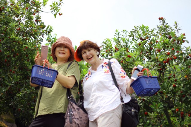 午餐后,大家驱车前往第二站----龙海浮宫镇,体验采摘杨梅的乐趣。所谓“梅子留酸软齿牙”,片片杨梅树枝繁叶茂,颗颗杨梅果挂满枝头。老师们边吃边讨论着杨梅的酸甜回甘,孩子们穿梭在杨梅林里,急切地寻找着那颗“最大的杨梅”,大家有说有笑,其乐融融。短暂而开心的杨梅采摘结束后,大家无不意犹未尽,唇齿留“酸”!