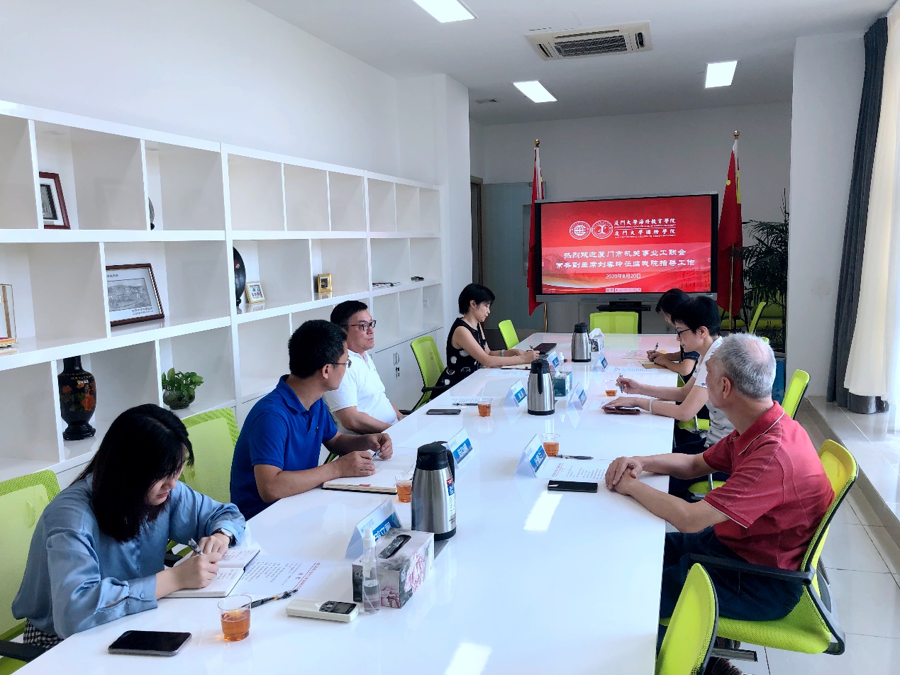 2020年8月20日,市机关事业工会联合会常务副主席、市直机关事业工委主任刘春玲在校工会常务副主席叶鹏飞的陪同下,莅临我校海外教育学院/国际学院指导工会工作。