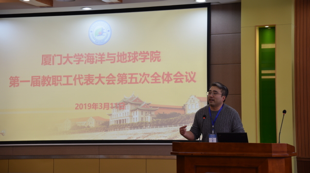 3月11日中午,海洋与地球学院第一届教职工代表大会第五次会议于在翔安校区希平楼C2-403会议室隆重举行,学院党政班子、教职工代表共55人与会,大会由学院工会主席李骁麟同志主持。