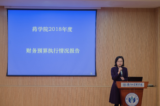 张晓坤院长向大会作学院工作报告,张院长分别从学院党的建设、思想政治工作、学科建设、人才培养、队伍建设、科研建设、社会服务、对外交流等方面总结了学院2018年的工作情况,并对学院2019年的重点工作做出了说明和部署。他强调,2019年是学校深化综合改革、推进“双一流”建设的重要一年,学院要以习近平新时代中国特色社会主义思想为指导,全面贯彻党的十九大精神,认真贯彻落实学校的各项工作部署,发挥学科优势特色,做好药学博士点、专硕点的建设;提高人才培养质量,深化教学改革,推进个性化培养;加强队伍建设,充分发挥一流人才团队的作用;提升科研水平,以国家重大需求为导向,增强原始创新科研能力;增强服务社会能力,继续推动高价值创新成果的转化应用;提高国际化办学水平,促进师生对外交流与合作;全院教职工团结奋进、共同努力,进一步推动学院事业高质量、内涵式发展。