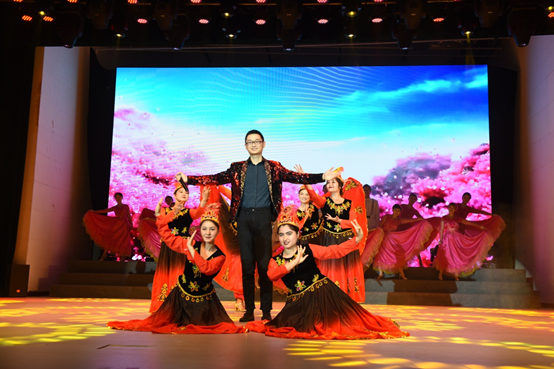 整个表演的形式多样,内容丰富精彩,以一支激情四溢、国家级水准的拉丁舞表演开场,用哈萨克族同学纯熟动听的冬不拉现场弹奏贯穿始终,药学院男教师领衔独唱,深情大气地完美演绎了这首大家耳熟能详的歌曲,尤其是伴以药学院特色的少数民族学生歌舞团原汁原味的新疆舞表演,再加上教师们富有韵律的彩裙伴舞和沙锤伴奏,将整首歌的民族气息烘托渲染到极致。