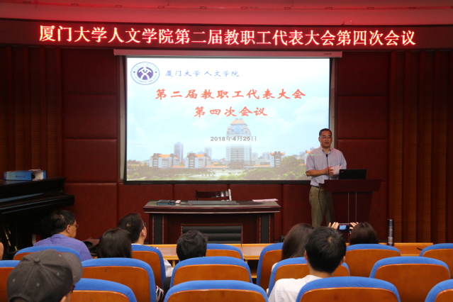 4月25日下午,厦门大学人文学院第二届教职工代表大会第四次会议在南光一101报告厅顺利举行。会议以“高举中国特色社会主义伟大旗帜,深入学习贯彻习近平新时代中国特色社会主义思想,全面贯彻落实党的十九大和十九届一中、二中、三中全会精神,勠力同心,锐意进取,坚持以人为本,坚持院务公开,促进学院管理的民主化和科学化,为建设国内一流、世界知名人文学院而努力奋斗”为指导思想。大会由人文学院党委书记王炳华主持,人文学院教职工代表出席本次会议。