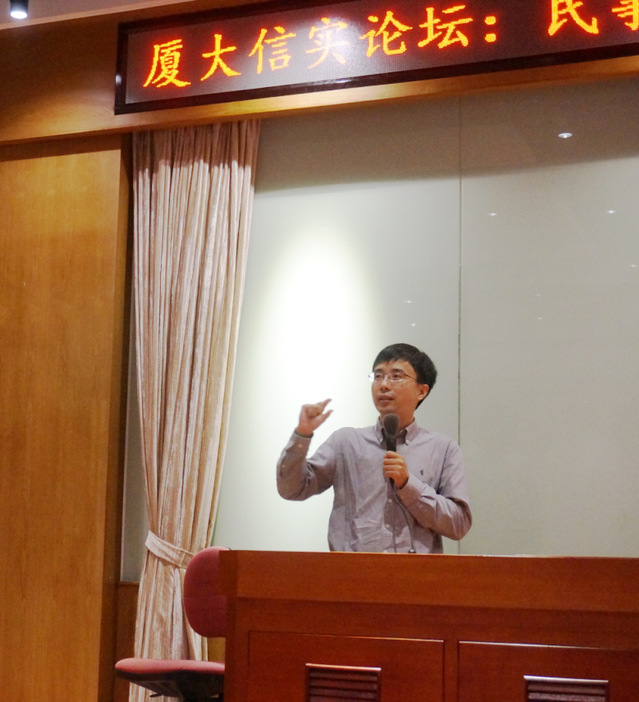 2017年5月19日晚,我院与福建联合信实律师事务所合作举办的厦大信实论坛,非常荣幸地邀请到南京大学法学院解亘教授,于厦门大学法学院B138教室分享了一场以“民事行为能力与监护制度在我国民法总则中的定位”为名的精彩讲座。