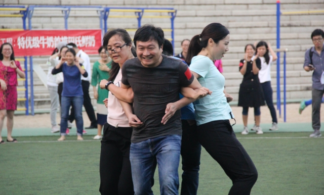 活动开始,老师们自由组成红、黄、蓝三队。第一个比赛项目是“四人五足”,正式比赛之前,老师们都在紧张地练习,希望自己的队伍能拿第一。比赛正式开始后,黄队在开始处于劣势,但队员们并没有因此而气馁而是团结一致、相互配合,最终超越蓝队,获得第二。