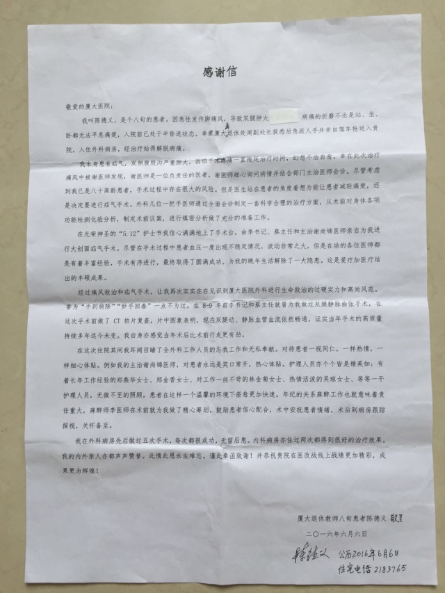 日前,厦门大学医院收到厦门大学机电系退休教师陈德义同志发来的感谢信。
