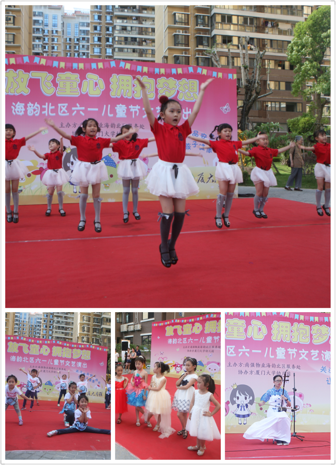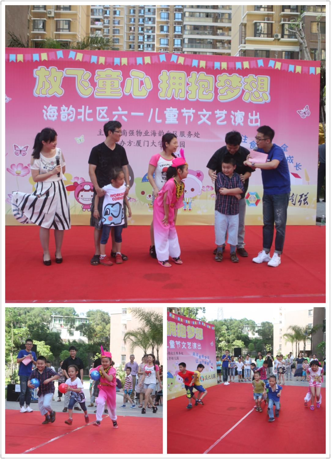 周末的阳光洒在小区里,营造出和谐的光和影美景,让人身心愉悦。为了让社区小朋友度过一个愉快难忘的节日,5月28日下午,南强物业海韵北区服务处携手厦大幼儿园举办了“放飞童心,拥抱梦想”社区文化活动。此次活动共有一百多名的业主和小朋友参加,大家在热情洋溢的表演和精彩纷呈的互动中庆祝六一儿童节。