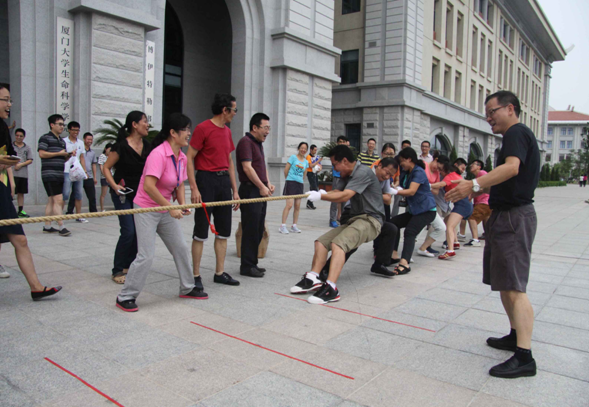 最后压轴的是拔河比赛,前两项比赛完成后,全院的教职工集合到学院大门口,摩拳擦掌开始准备拔河比赛。拔河比赛每个工会小组上场女生3名、男生5名。比赛一开始,呐喊声、加油声此起彼伏,正在拔河的两个队伍更是感受到团结的力量,“一二、一二、一二”,大家互相鼓励卯足了劲不服输,劲往一处使。经过激烈的比赛,最后学院办公室工会小组获得拔河冠军,生化与生物技术系工会和分析测试中心小组屈居23名。获胜的队伍大家开心地击掌庆贺着,惜败的队伍,大家互相握手鼓励着。不论输赢每个人脸上都洋溢着笑容,欢声笑语映着余晖撒满了黄朝阳楼。