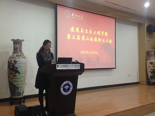 20153月18日下午,建筑与土木工程学院第三届第二次教职工大会在曾呈奎楼会议厅顺利举行。参加本次大会的成员有学院院全体在职教职工。会议由学院工会主席黄宇霞主持。