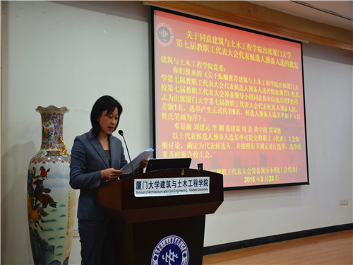 20154月1日,建筑与土木工程学院出席厦门大学第七届教职工代表大会代表选举大会在曾呈奎楼118室顺利举行。院党委书记刘梅老师主持选举大会,建筑与土木工程学院、建筑设计研究院全体教职工出席大会。