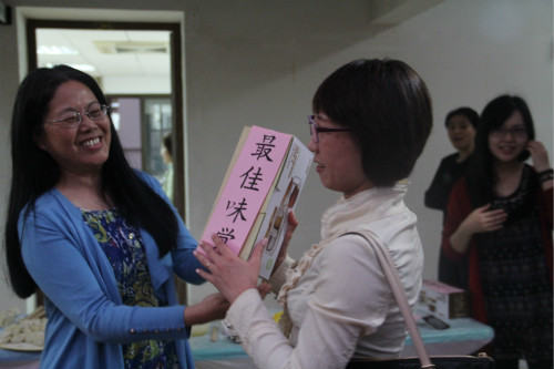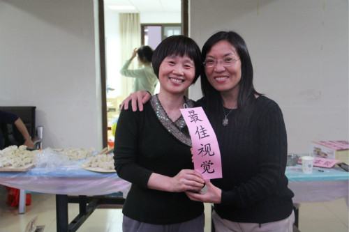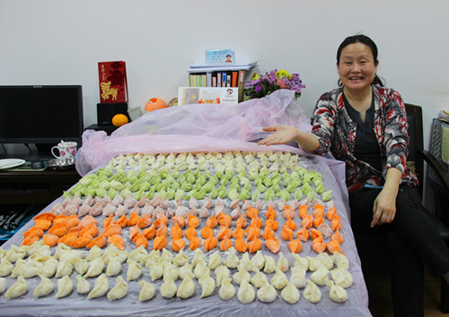 下午两点,“欢乐分享会”开始进行第一项活动——集体包饺子。“饺子军团”挽起袖子,有条不紊地开始了准备工作。在一片欢声笑语中,一张张饺子皮飞旋而出,数百个各色水饺“亭亭玉立”。这里有外语教学部老师们制作的韭菜猪肉饺,有日语系老师们贡献的芹菜香菇马蹄饺,有欧语系老师们主理的白菜香菇猪肉饺,还有英语系老师亲手包制的荠菜猪肉饺。法语系老师们更是别出心裁,用各种蔬菜汁调配成五彩素水饺,令人耳目一新。