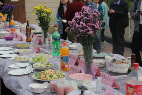 下午五点,报名参加手工菜品展示活动的老师们陆续到场,大家纷纷从家里带来了精心准备的独家秘制私房菜。近20米长的展示台上摆满了香气四溢的各色菜品,从餐前甜品到主食,从传统的中式私房菜到西式、日式经典菜品,40多道手工菜品令人垂涎欲滴。