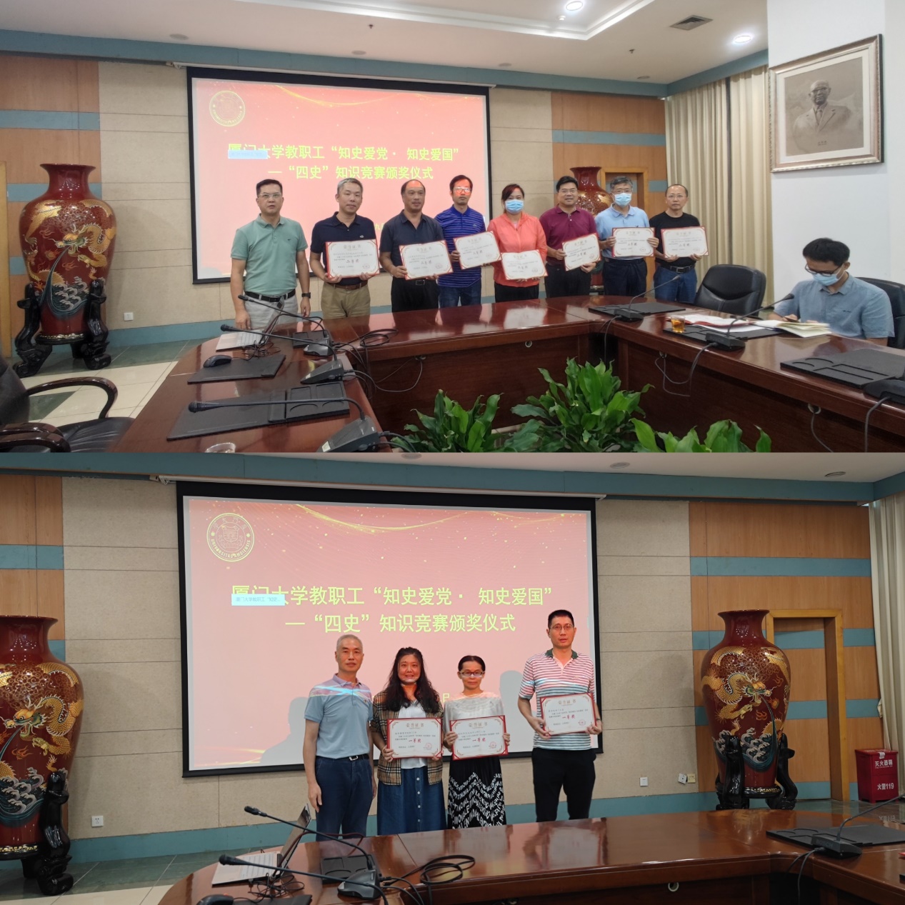 首先,会议为在2021年度厦门大学教职工“知史爱党·知史爱国”—“四史”知识竞赛中获得集体奖的单位颁发证书。校工会副主席茹晓燕、蔡伟毅、余炳建依次上台颁奖,常务副主席叶鹏飞为集体一等奖的单位颁奖。