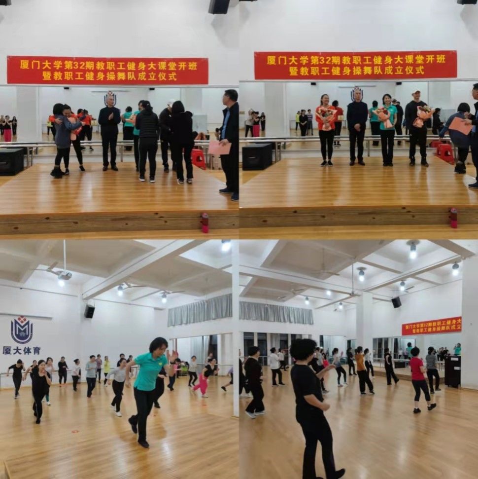 为深入学习贯彻习近平总书记关于全民健身、健康中国讲话精神,推进教职工“健康生活,快乐工作”行动方案,丰富教职工的业余文化生活,提升教职工的身心健康指数,3月10日晚,厦门大学第32期教职工健身大课堂开班暨教职工健身操舞队成立仪式在王清明游泳馆二楼健美操馆顺利举行。开班仪式由校工会副主席余炳建主持,校工会常务副主席叶鹏飞出席并致辞。