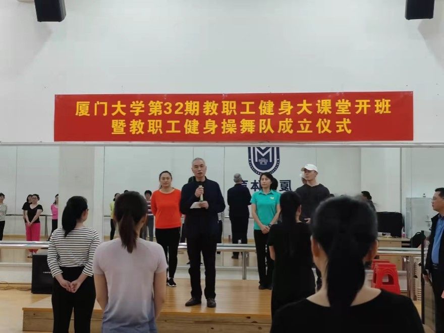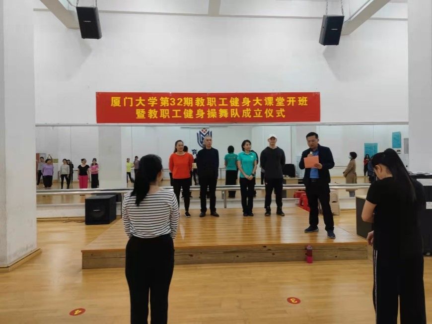 最后,校工会副主席余炳建宣布,厦门大学第32期教职工健身大课堂开班!厦门大学教职工健身操舞队成立!