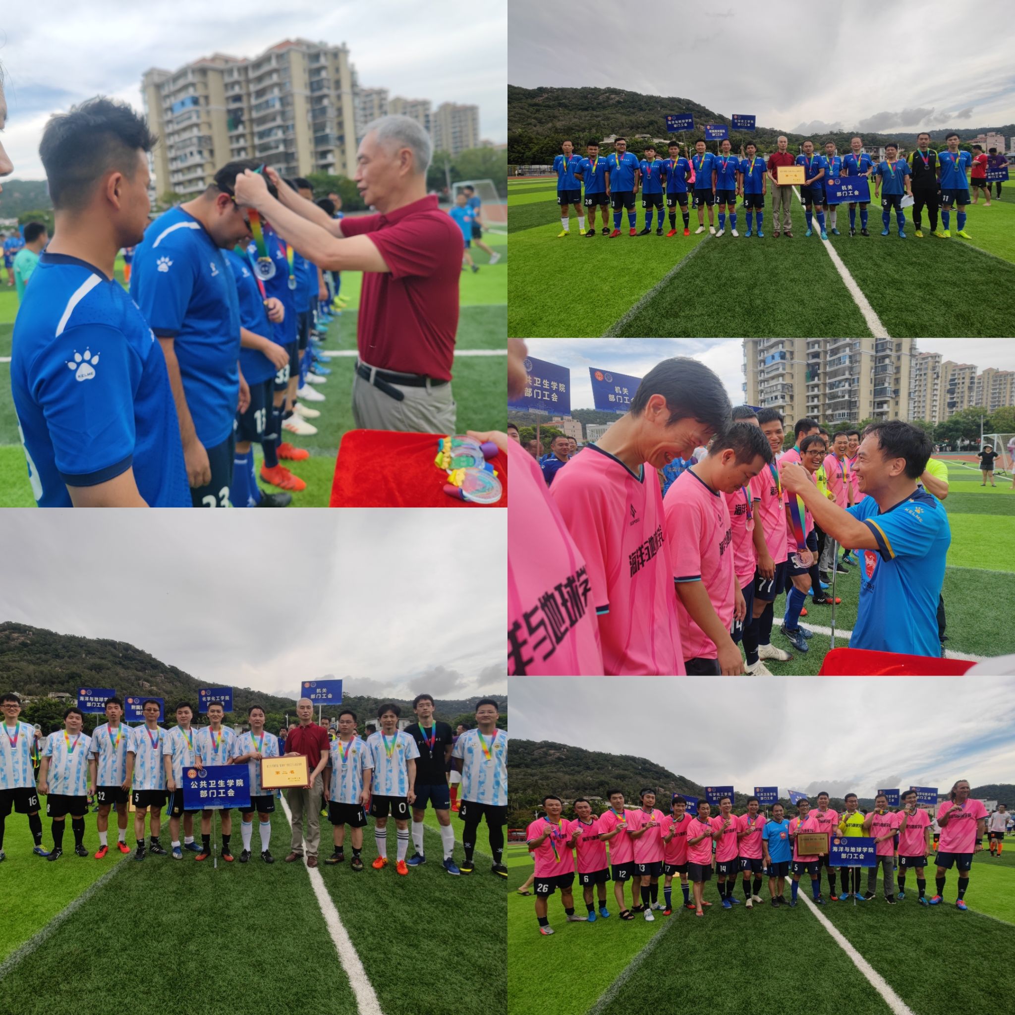 校工会常务副主席叶鹏飞,附属翔安医院党委书记、校教职工足球协会会长张建安,漳州校区管委会副主任、机关部门工会主席余自中,校工会副主席余炳建为获得前八名队伍颁奖,并与获奖队伍合影留念。