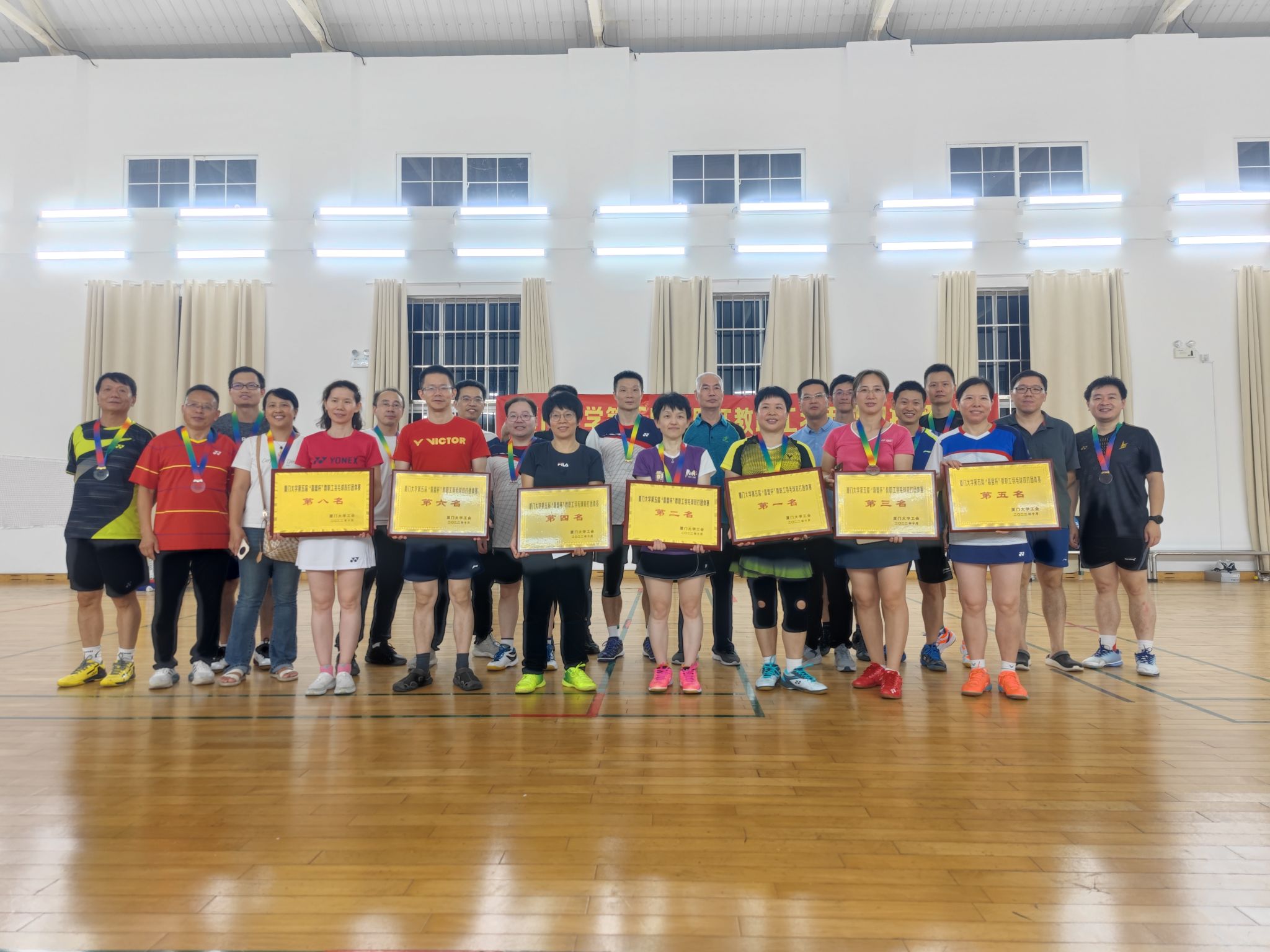 校工会常务副主席叶鹏飞、副主席余炳建和校教职工羽毛球协会会长林敏为获得前八名队伍颁奖,并与获奖队伍合影留念。