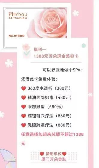 凡到场人员,均可获赠1388元芳朵美容卡1张、厦大翔安医院8折体检打折卡1张、两山驻海-贺兰山东麓葡萄酒(厦门)体验中心提供的丰厚礼品。
