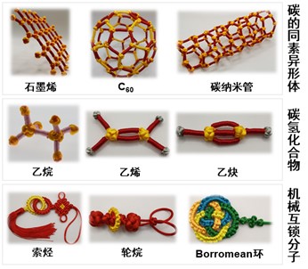 中国结是一种传统的手工编结艺术,具有悠久的历史和丰富的文化内涵。在中国传统节日、婚庆等重大活动中,中国结经常被用作装饰品,以表达吉祥、团结、美好的寓意。中国结有多种结式,例如双钱结、纽扣结、琵琶结、团锦结、十字结、吉祥结、万字结、盘长结、藻井结、双联结、蝴蝶结、锦囊结等。而分子是由组成的原子按照一定的键合顺序和空间排列而结合在一起的整体,这种键合顺序和空间排列关系称为分子结构。