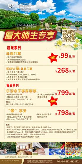 日月谷温泉度假村以其优质天然的地热温泉闻名遐迩。度假村内环境清幽雅致,绿树成荫,是喧嚣都市中的一片世外桃源。此次活动中,日月谷温泉票面向厦大教职工特惠放送。平日温泉票低至99元,亲子客房套票低至799元,让您轻松享受温泉带来的舒适与惬意。除了门票优惠,活动还推出了特色温泉套餐,以超值的价格涵盖了温泉体验、精致餐饮等多项服务。