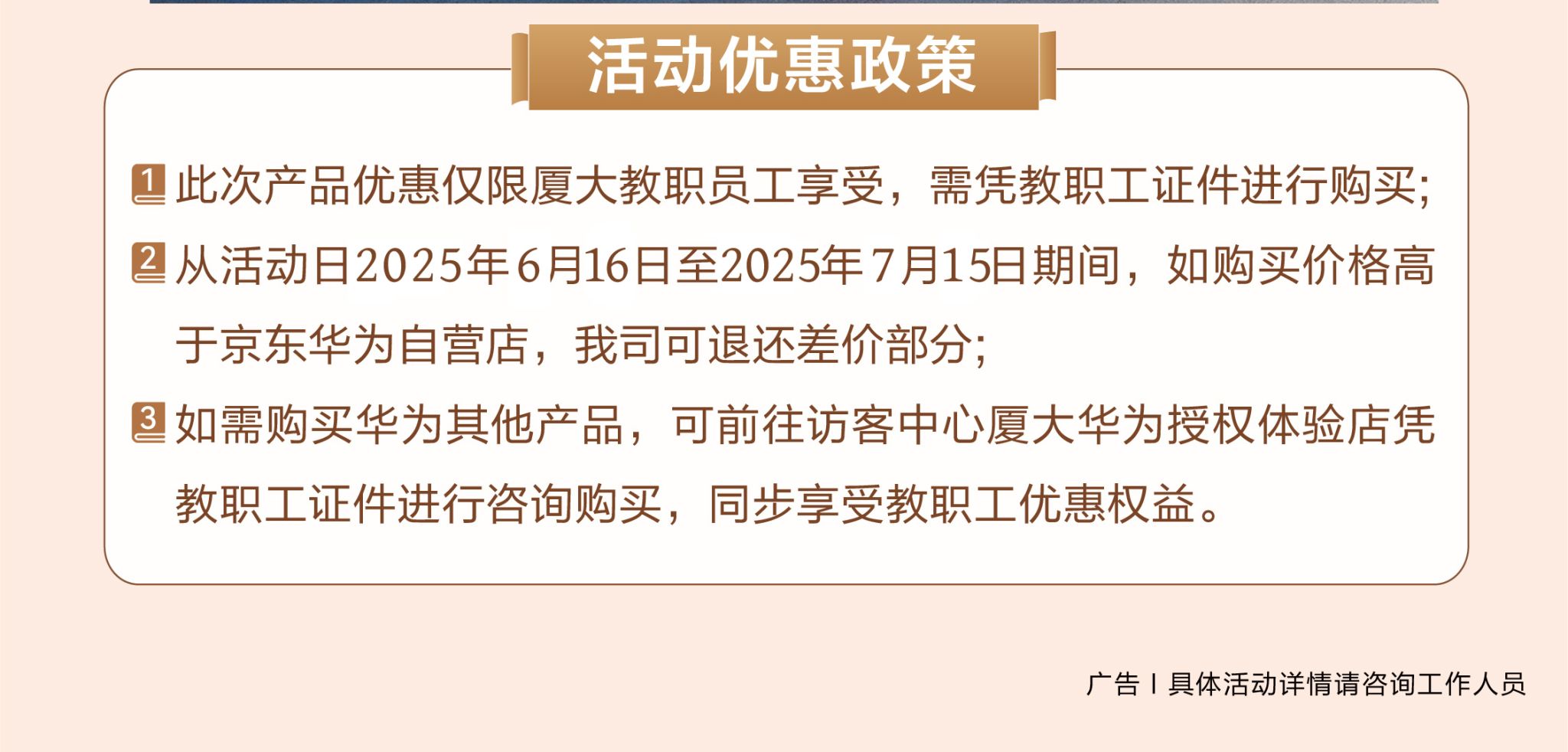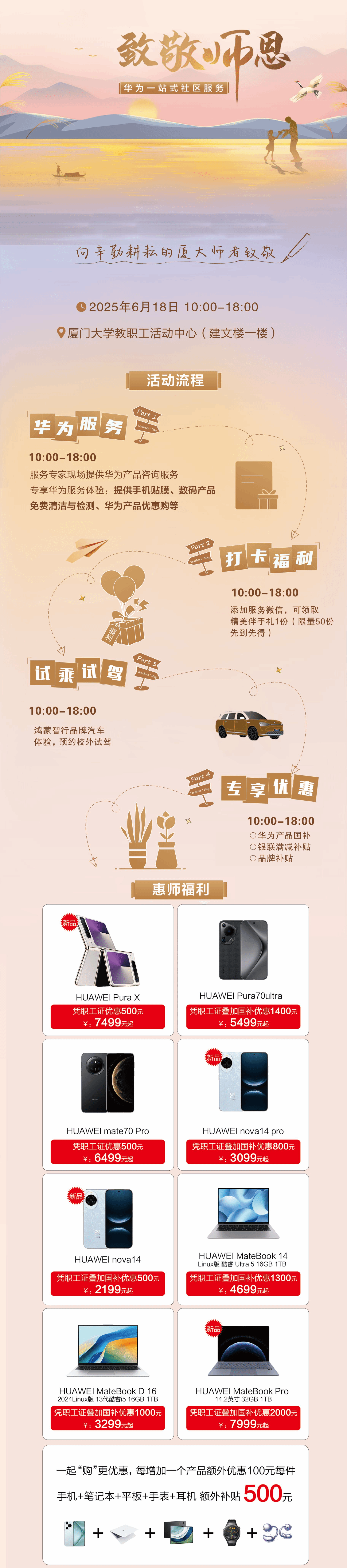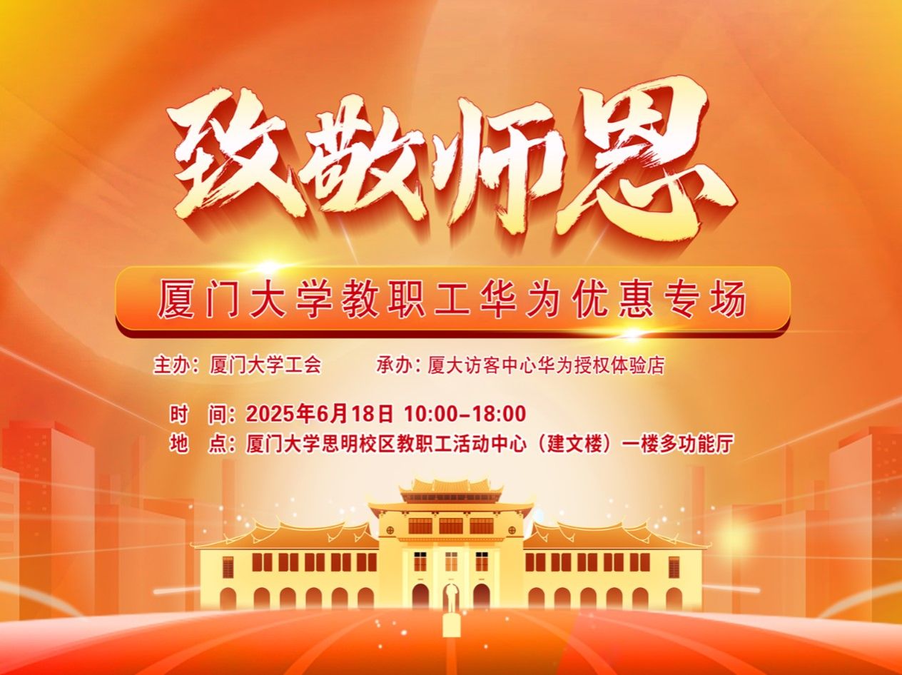 凤凰花开,蝉鸣盛夏。在这充满希望与活力的时节,厦门大学工会积极响应政策号召,深入贯彻落实中共中央办公厅、国务院办公厅《提振消费专项行动方案》及全国总工会助力职工文化旅游消费“十项措施”精神,联合厦大访客中心华为授权体验店,开展“致敬师恩”年度第四次知名企业进校园送福利活动,为教职工带来实实在在的福利,为教职工献上暖心的关爱。