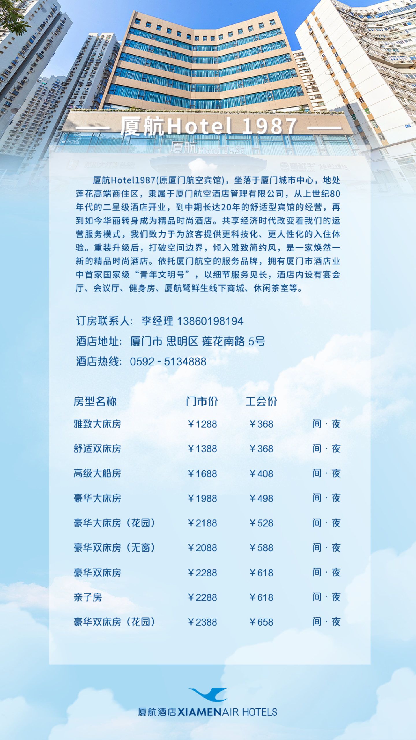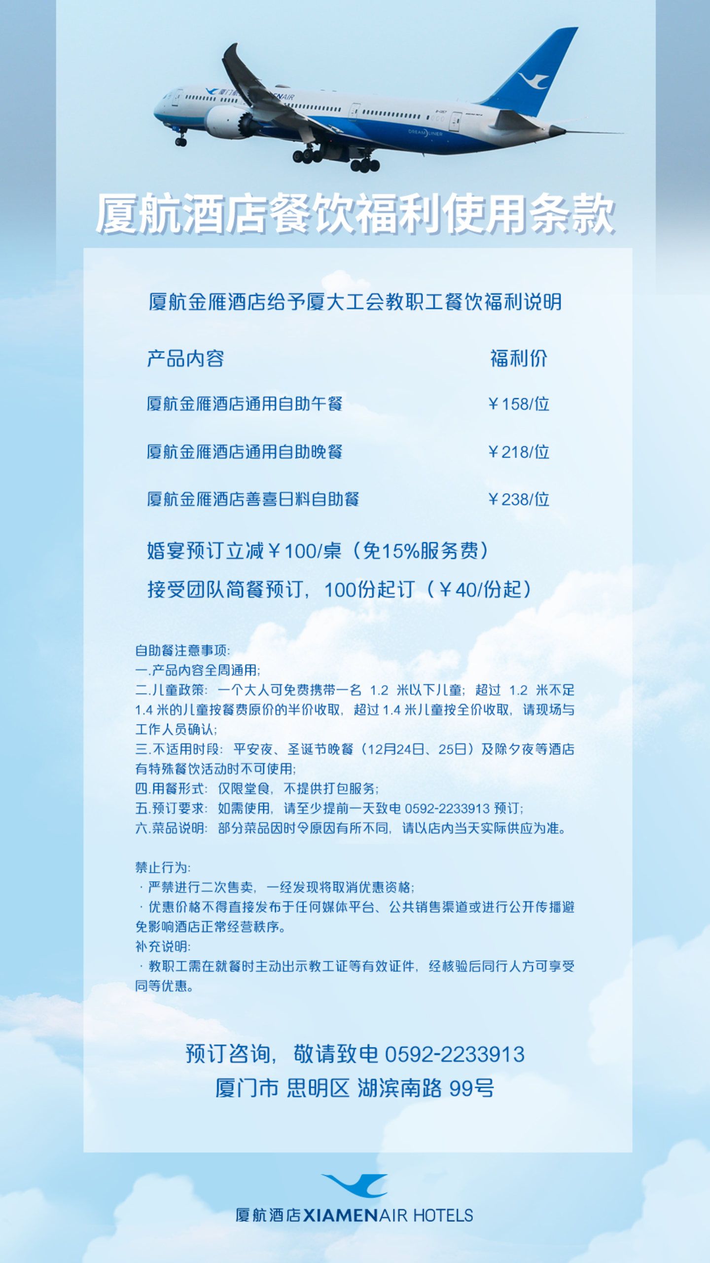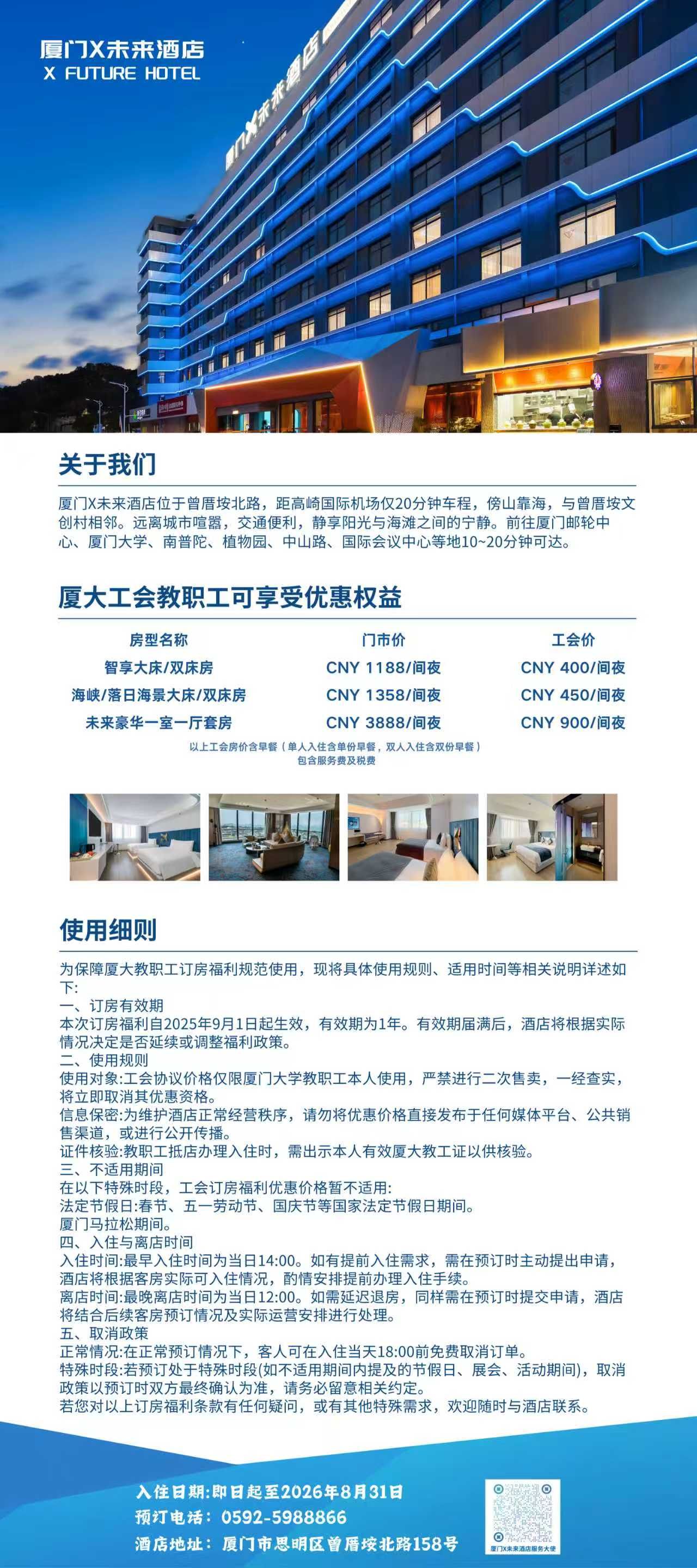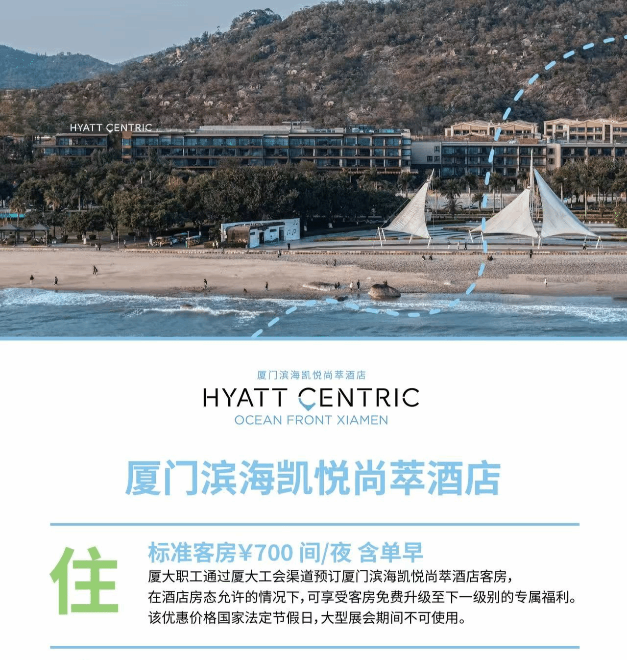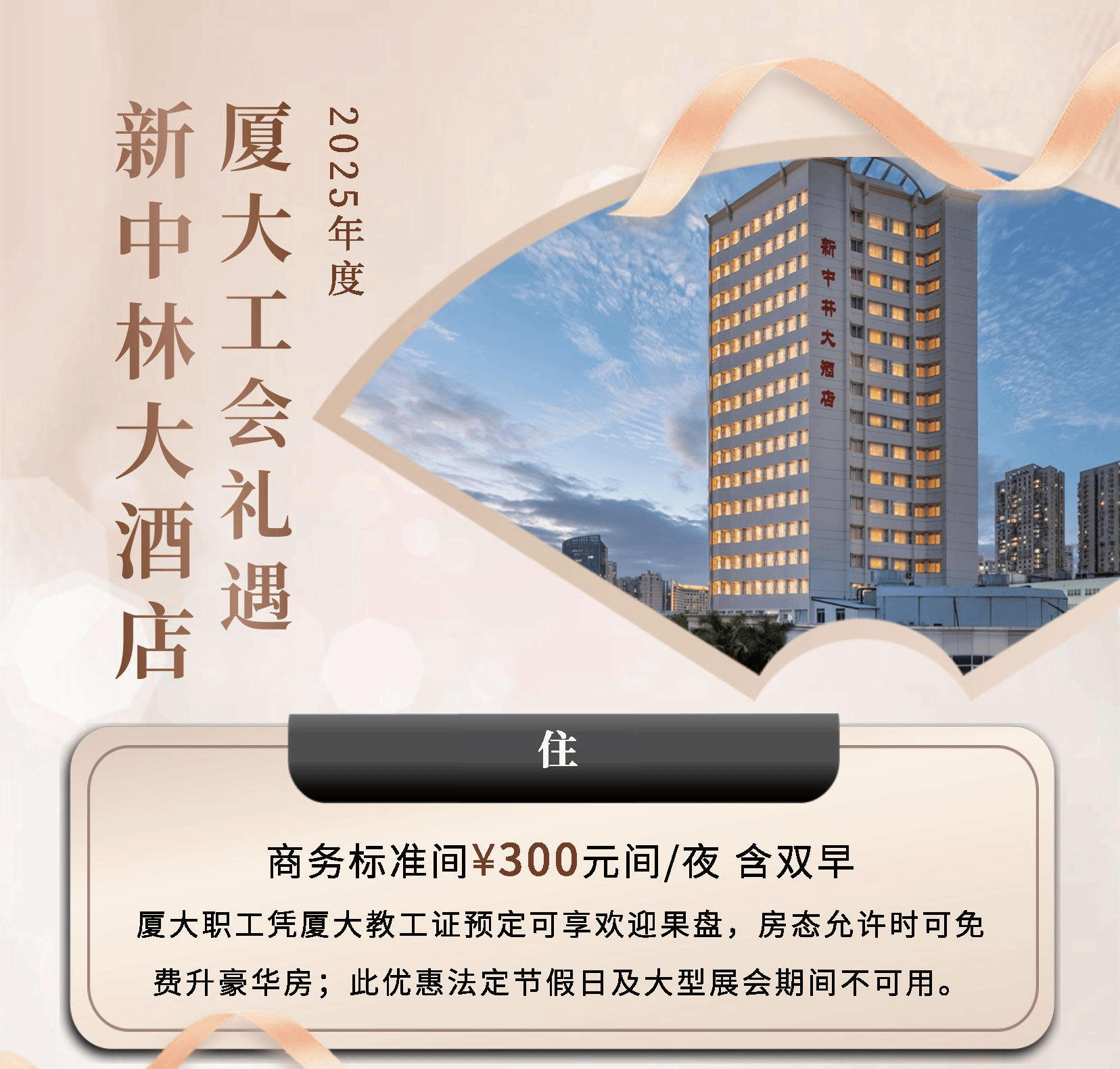 住宿优惠:教职工凭厦门大学教工卡,可尊享合作精选酒店门市价折上折优惠,无论是公务出行还是休闲度假,都能享受高性价比的舒适体验。