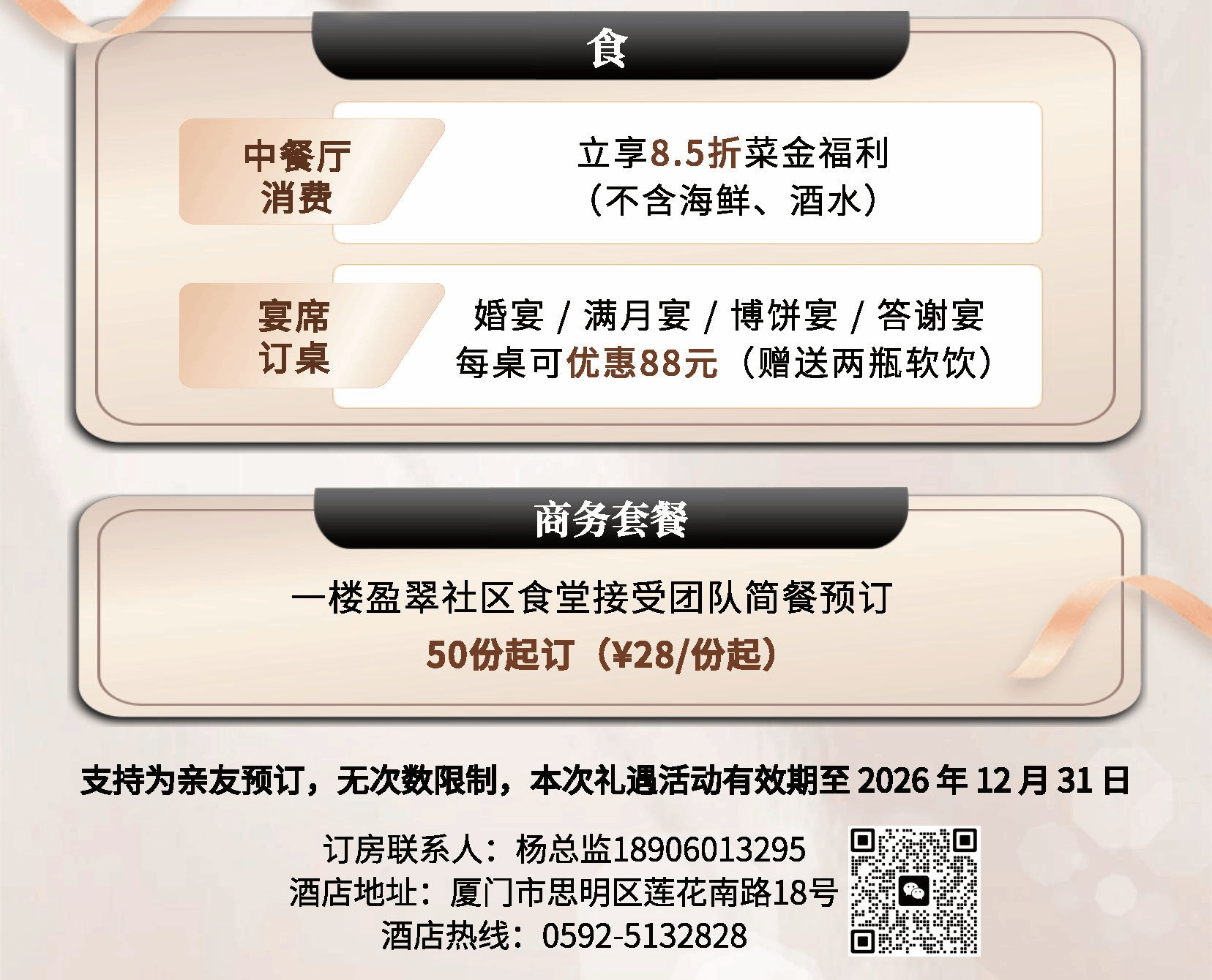 推出超值礼遇!中餐厅消费享菜金8.5折,宴席订桌每桌立减88元,团队简餐28元/份起,还可为亲友预订,优惠持续至2026年底。