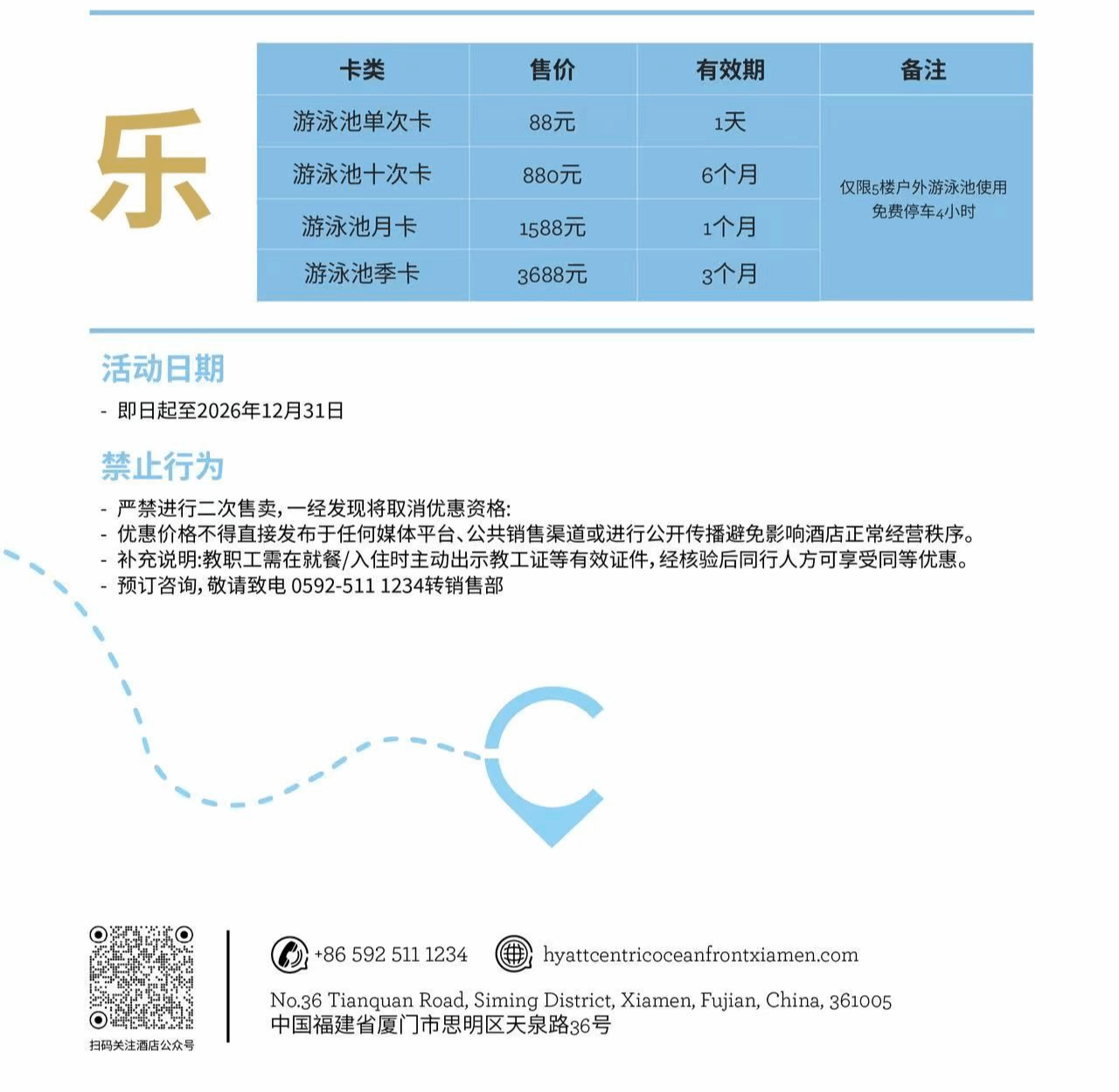 教职工可享超值游泳池次卡/月卡优惠,最低单次仅88元,有效期至2026年底,凭教工证即可预订,畅享清凉一夏。