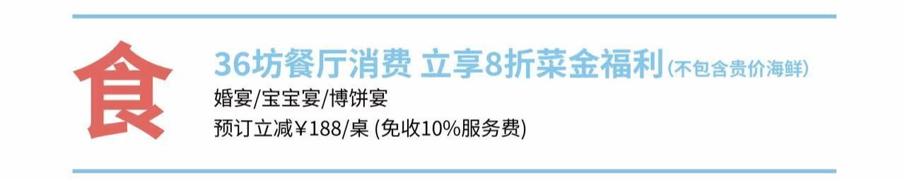推出超值餐饮福利,在36坊餐厅消费可享菜金8折优惠,预订婚宴/宝宝宴/博饼宴更享每桌立减188元并免服务费!
