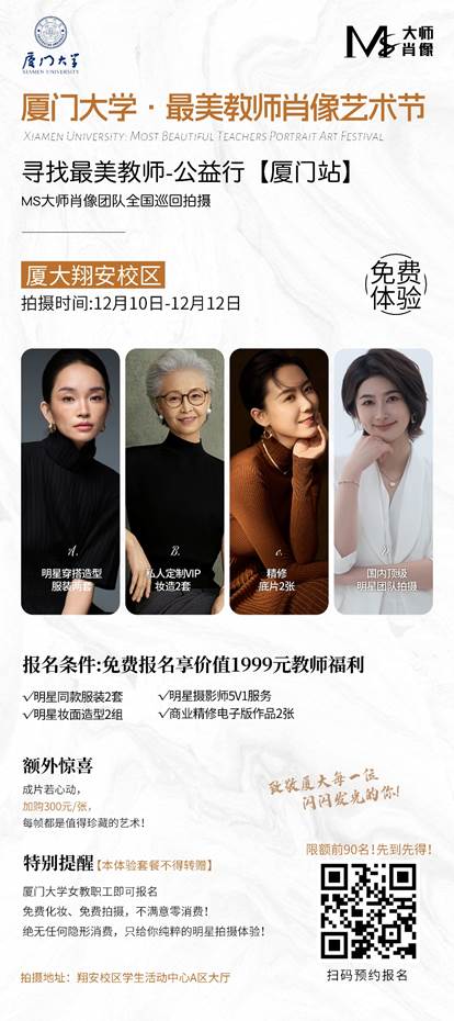 根据翔安校区教职工的需求,经研究,在开展思明校区最美教师肖像拍摄活动的同时,校工会、校妇委会联合MS大师肖像团队,增加厦门大学《岁月芳华》最美教师肖像拍摄惠师活动翔安校区专场。现将有关事项通知如下: