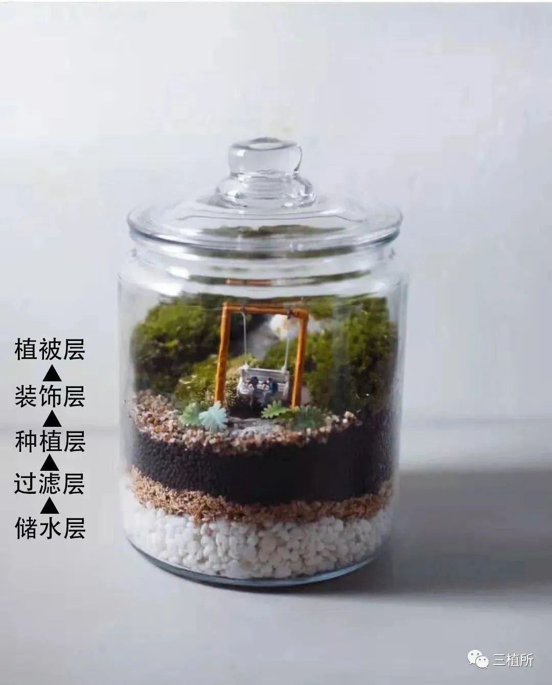 微景观,用苔藓植物和蕨类植物等生长环境相近的植物,搭配上各种造景材料、手办玩偶等,运用美学的构图原则将其组合种植在瓶子里,构成妙趣横生的场景,是当下较为流行的一种景观生态瓶。