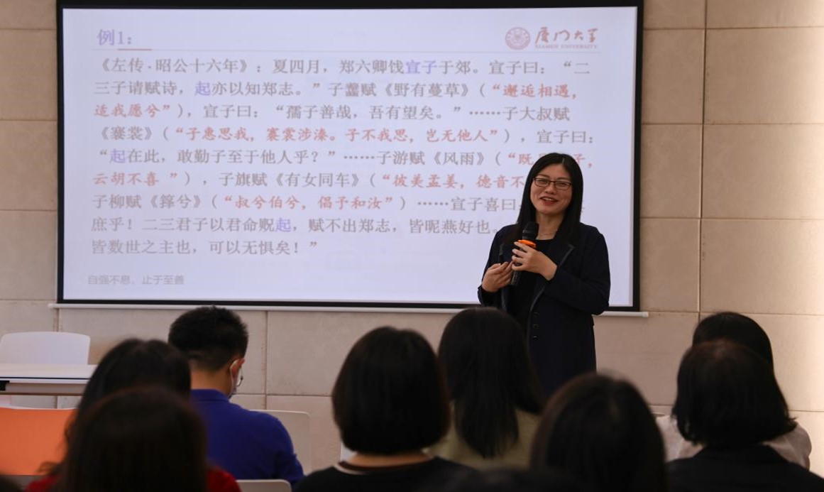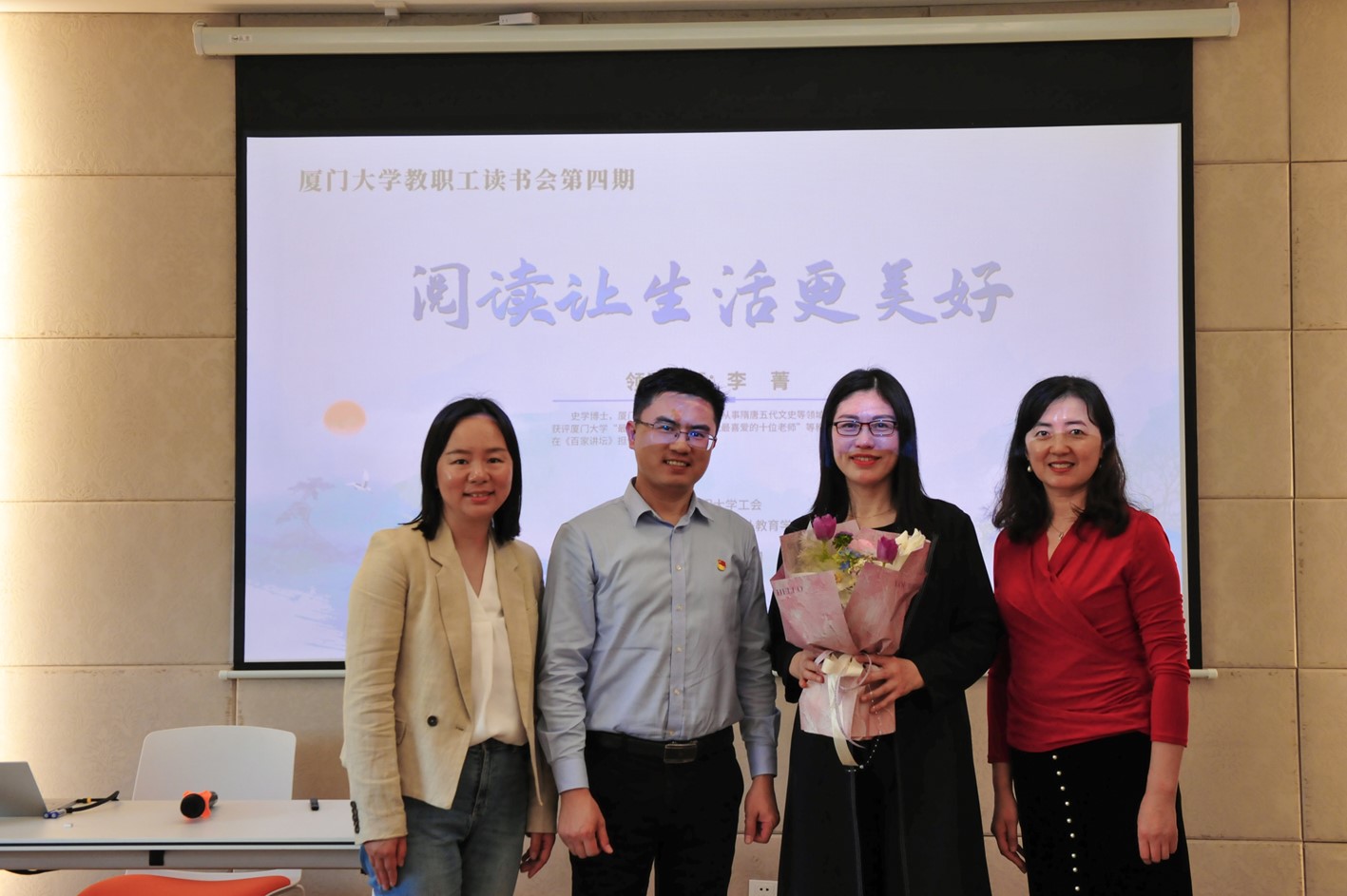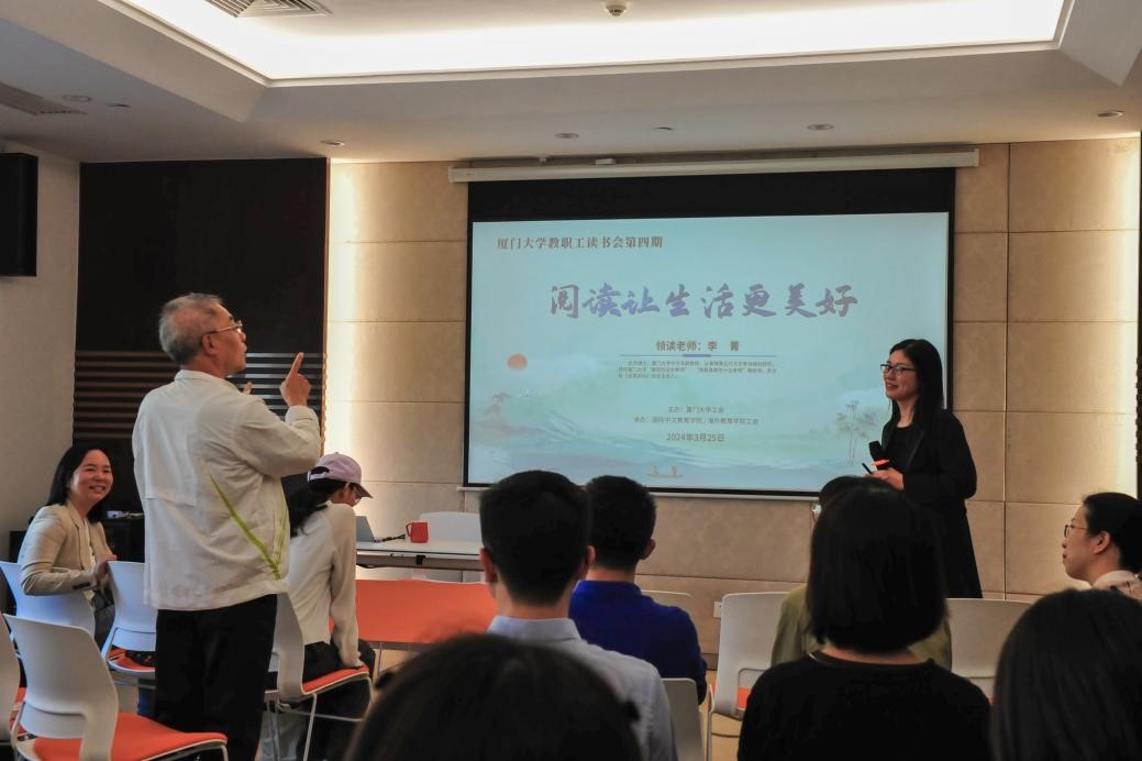 春读书,兴味长。为了引领教职工漫步书海、品味人生,进一步推进书香校园建设,鼓励全民阅读,积极主动传承和发扬中华优秀传统文化,2024年3月25日中午,“阅读让生活更美好”厦门大学教职工读书会第四期在翔安校区德旺图书馆二楼北厅新华书店举行。本期读书会由厦门大学工会主办,国际中文教育学院/海外教育学院工会承办,校工会副主席茹晓燕主持,吸引了来自20余个学院的80余名教职工参与。