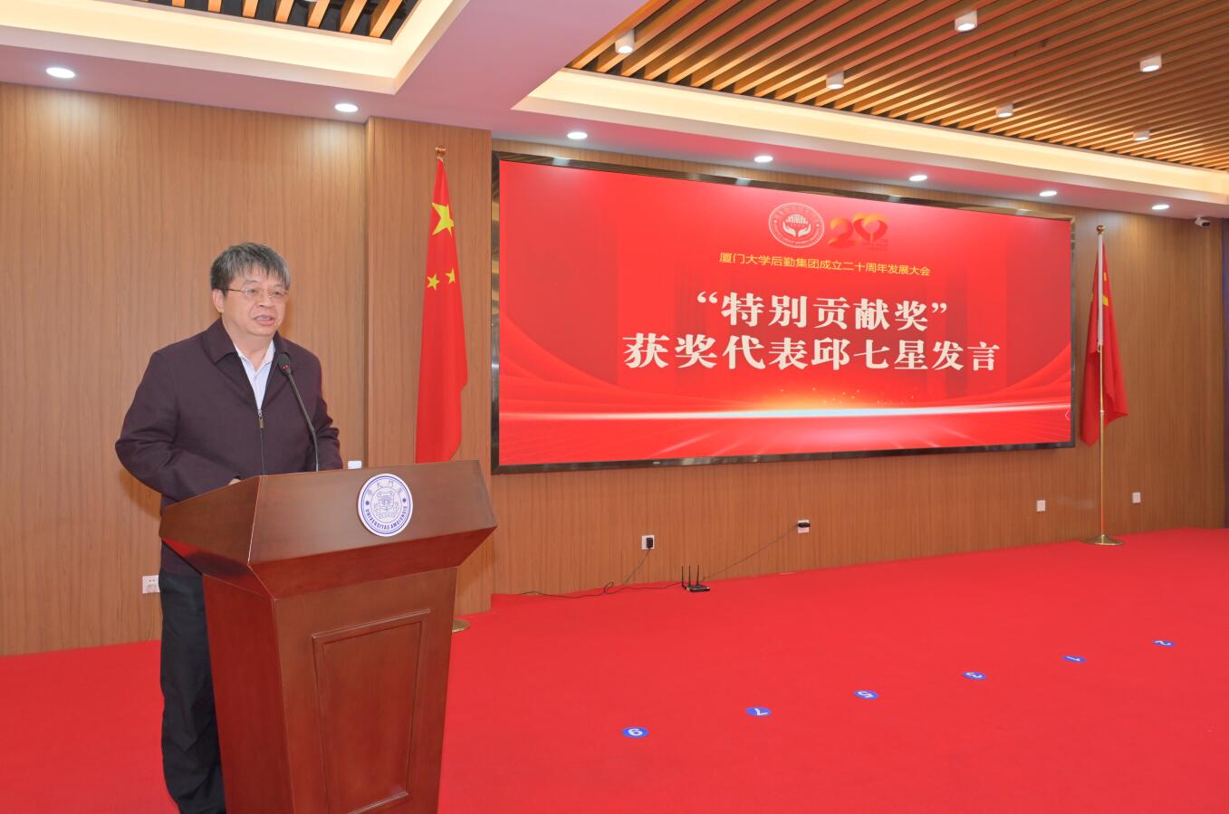 受表彰的二十周年特别贡献奖代表、集团第一任总经理、管理学院党委书记邱七星在发言中回顾了在集团任职期间的工作情况,他深情地总结了对后勤人的四点体会和感受:一是讲政治,坚决贯彻执行学校的部署要求;二是顾大局,从大局出发,干了再说,不计得失;三是讲奉献,苦干实干,克服困难,圆满完成各项重大保障任务;四是讲感情,后勤人一起吃苦,一起流汗,不变的是后勤人精神,忘不掉的是后勤人的情谊。