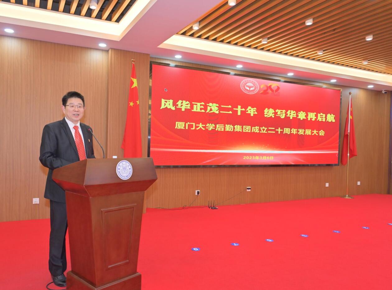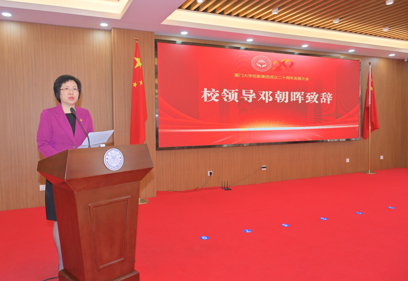 邓朝晖首先代表校党委、校行政,向后勤集团成立二十周年及获奖的人员表示热烈祝贺,对二十年来后勤集团取得的成绩表示充分肯定。她表示,后勤集团成立二十年是苦干实干的二十年,是卓有成效的二十年,也是良性发展的二十年。二十年来后勤集团围绕安全生产、服务提升、文化建设、内控建设、人才建设等主题开展工作,圆满完成了抗击“莫兰蒂”超强台风、金砖国家领导人厦门会晤、第四届中国“互联网+”大学生创新创业大赛、百年校庆、疫情防控等急、难、险、重保障任务。二十年来,后勤集团的综合管理、服务保障水平大幅提升,先后获得了“全国青年文明号”等150多个先进集体荣誉称号,涌现出了160多个先进个人荣誉称号,确立了“四个一流”的建设目标,凝练出了“五抓五促”的务实举措,集团上下展现了昂扬向上的精神风貌、真抓实干的工作作风、行之有效的内部控制,取得了经济、社会效益双丰收,学校师生满意度和员工的幸福感、获得感逐步提升。她强调,在开启历史新征程的新起点上,后勤集团要以“五抓五促”为抓手,推进服务水平和服务能力高质量发展,一是全面加强党的领导和建设;二是牢固树立育人的理念;三是深入推进为师生办实事、办好事;四是加强干部职工队伍建设。