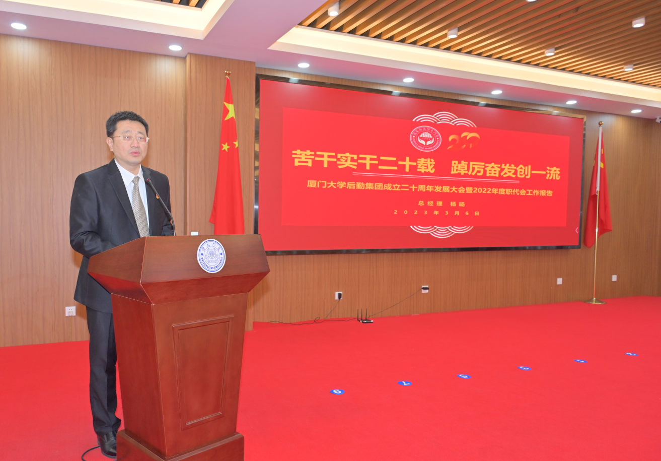 3月6日上午,后勤集团召开成立二十周年发展大会暨2022年度职工代表大会,主会场在东苑二楼报告厅,校党委常委、副校长邓朝晖,校工会常务副主席叶鹏飞,资产与后勤事务管理处处长苏清伟,校党建工作联络员郑建华,资产经营有限公司党委书记黄宇霞,集团历任领导班子成员邱七星、谢银辉、林公明、刘立荣、庄惠美、郑庆喜、陈有亮等,集团现任领导班子成员、一级岗管理骨干、党支部书记、工青妇委员、受表彰人员代表参加;各单位还以视频连线的方式设立分会场,二级岗管理骨干、受表彰人员在分会场参会。集团总经理杨旸作报告,党委书记杨云良主持大会。