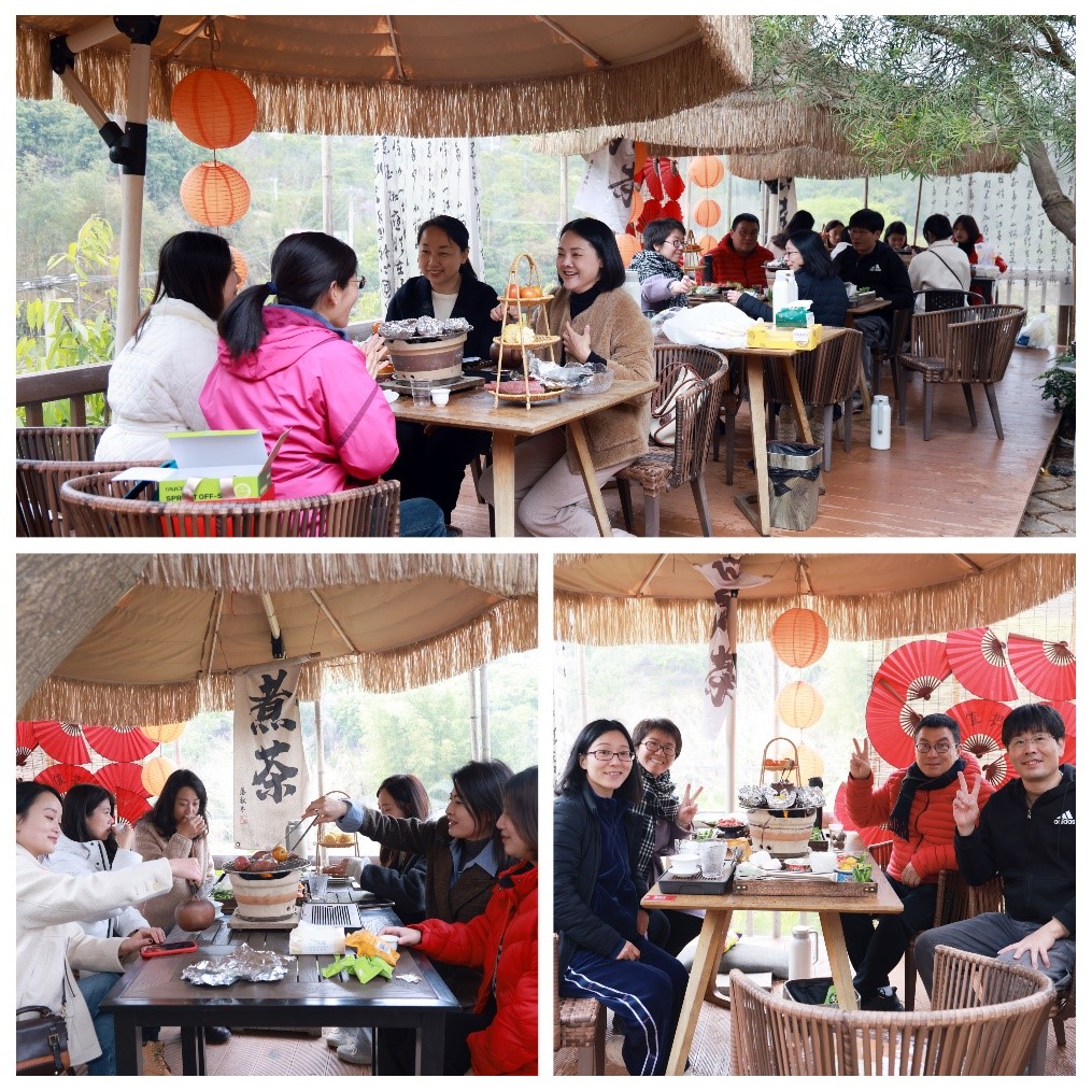 中午,大家来到隐藏在东坪山的山谷里,集团建、茶食、汉服妆造为一体的新空间——屿岁·过云山居,陶涛院长代表学院向全体女教职员工致以节日的问候和祝福,怀着对美好生活的憧憬,老师们一起共度午餐。饭后大家围炉而坐,泡上一壶清茶,看着鸟儿嬉戏,闲聊春日乐趣,享受片刻闲适时光。