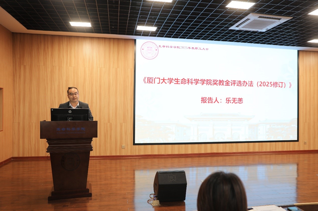 学院党委副书记乐无恙对《厦门大学生命科学学院奖教金评选办法(2025修订)》进行解释说明,全体教职工对办法修订内容进行审议并表决通过。