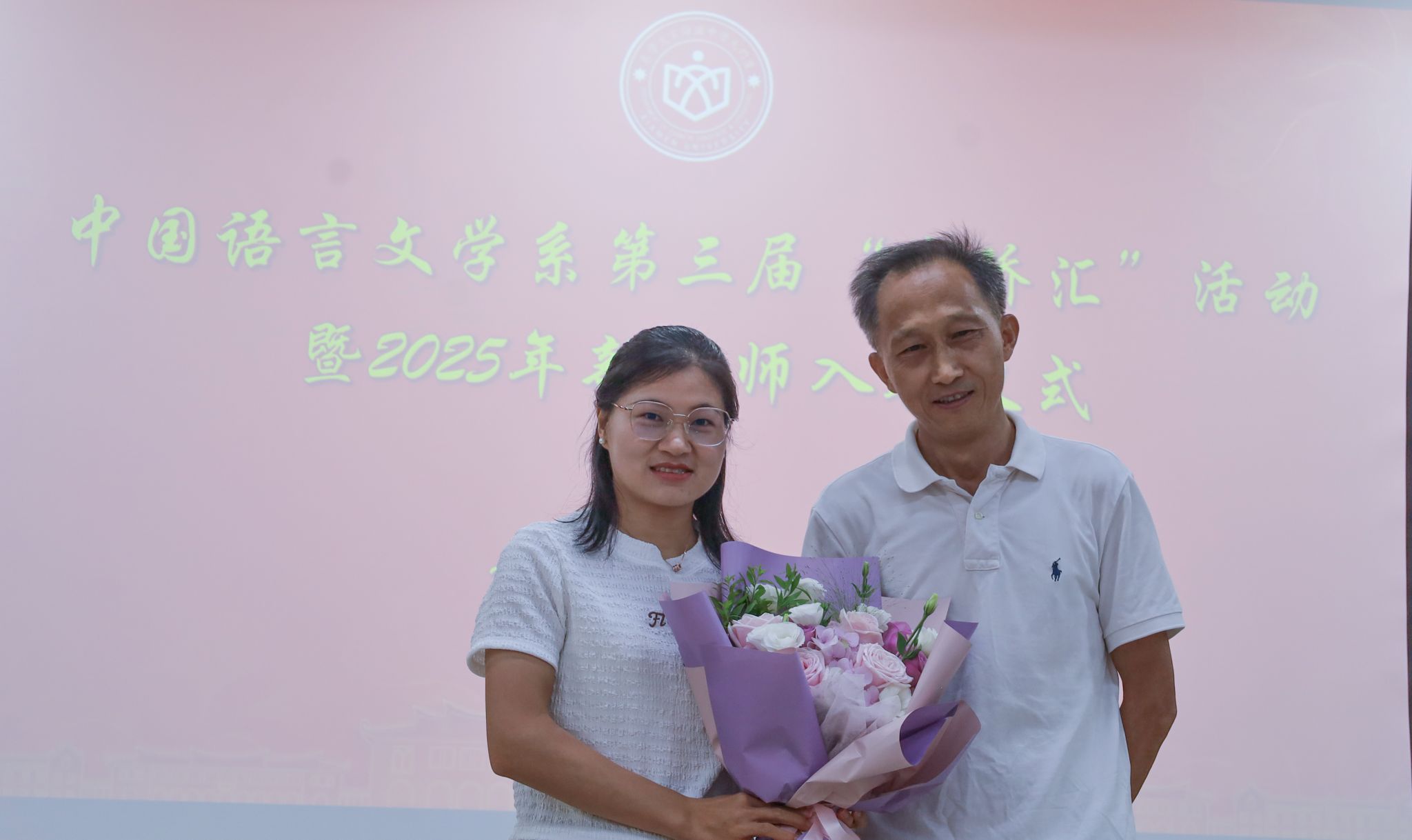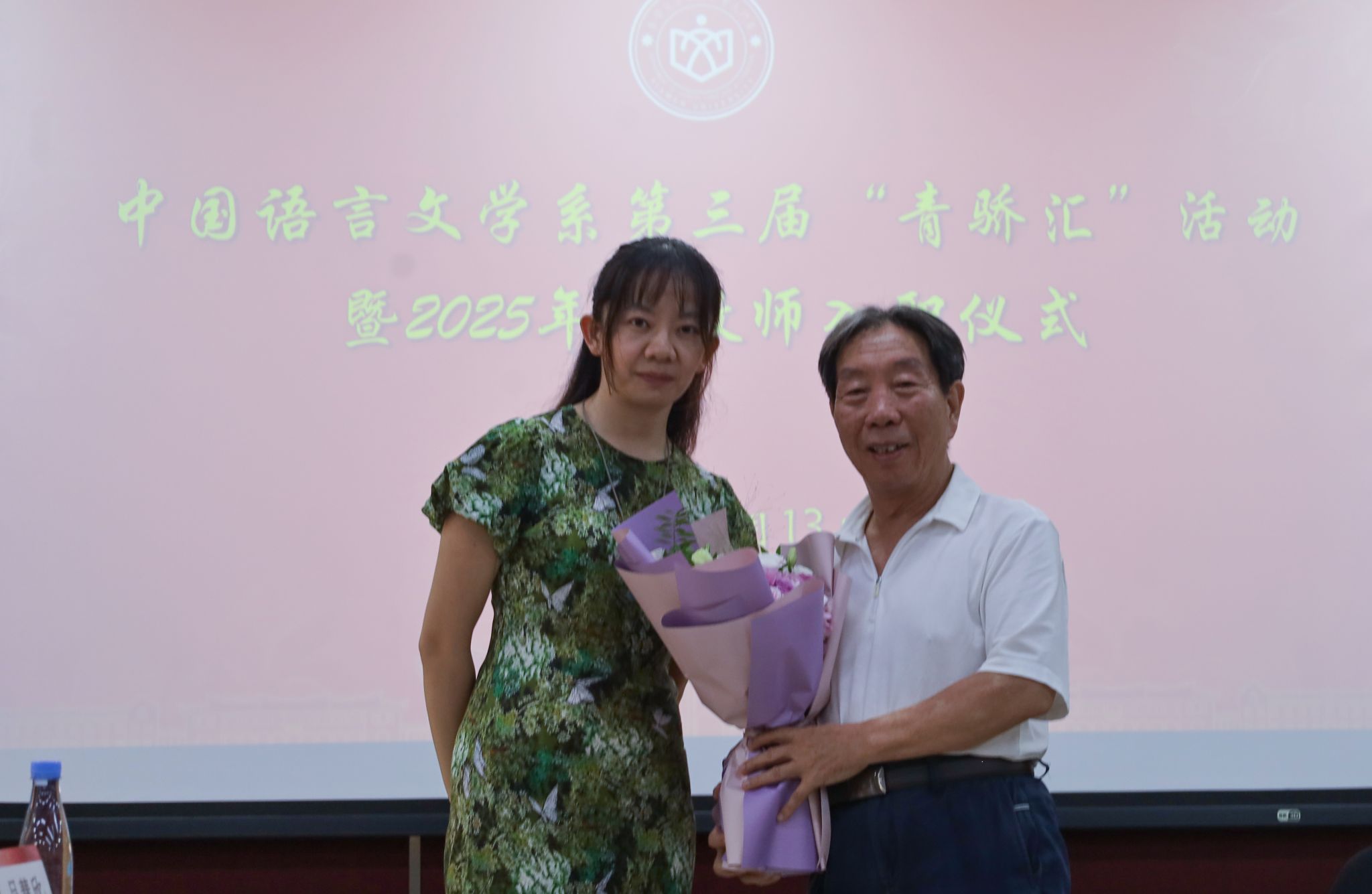 系党委书记黄宇霞宣布新新入职教师的退休及在职指导老师名单。新入职教师刘月悦、吴慧欣、张惠娟、杨皓童依次向其退休指导老师朱水涌、叶宝奎、李城希、夏光武敬茶、献花、赠送拜师礼。指导老师们向新教师回赠《中文系百年系庆学术论文集》等书籍,表达对新教师的殷切关怀和真挚祝福。