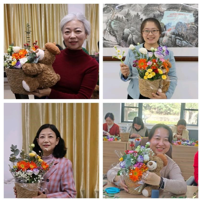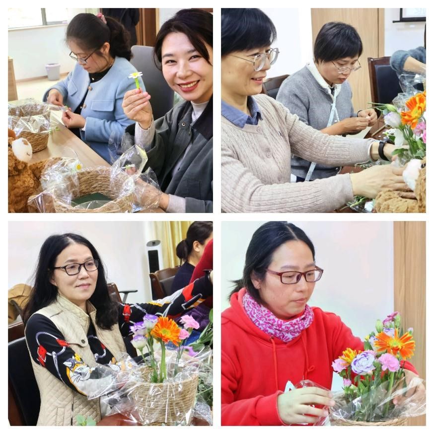 进入插花环节,活动现场花香四溢,各色玫瑰、洋桔梗、小雏菊等鲜花开箱摆放,可爱的小熊玩偶、乐高积木也早已准备就绪。专业花艺老师首先为大家讲解了插花的基本技巧、花材搭配原则以及乐高小熊与花艺结合的创意思路,从花材修剪的角度把控,到色彩层次的搭配,再到小熊摆件、乐高积木花的点缀技巧,都进行了细致的示范。讲解结束后,女教职工们纷纷动手创作——有的老师专注地修剪花材,精心调整每一枝花的角度;有的老师则精心安排乐高小熊的摆放位置,让萌趣的小熊与鲜花形成巧妙呼应;还有的老师相互交流创作心得,共享创作灵感。会议室笑语阵阵,原本普通的花材和积木,在大家的巧手下变成了一个个独具匠心的花艺作品。活动尾声,大家捧着自己的作品合影留念,一张张笑脸与缤纷的花艺相映成趣。参与活动的女教职工代表表示:“平时工作节奏快,趁这次活动正好稍作停顿。既能动手创作,又能和同事们交流互动,被鲜花环绕的感觉特别幸福和治愈,也让新年充满了仪式感。”