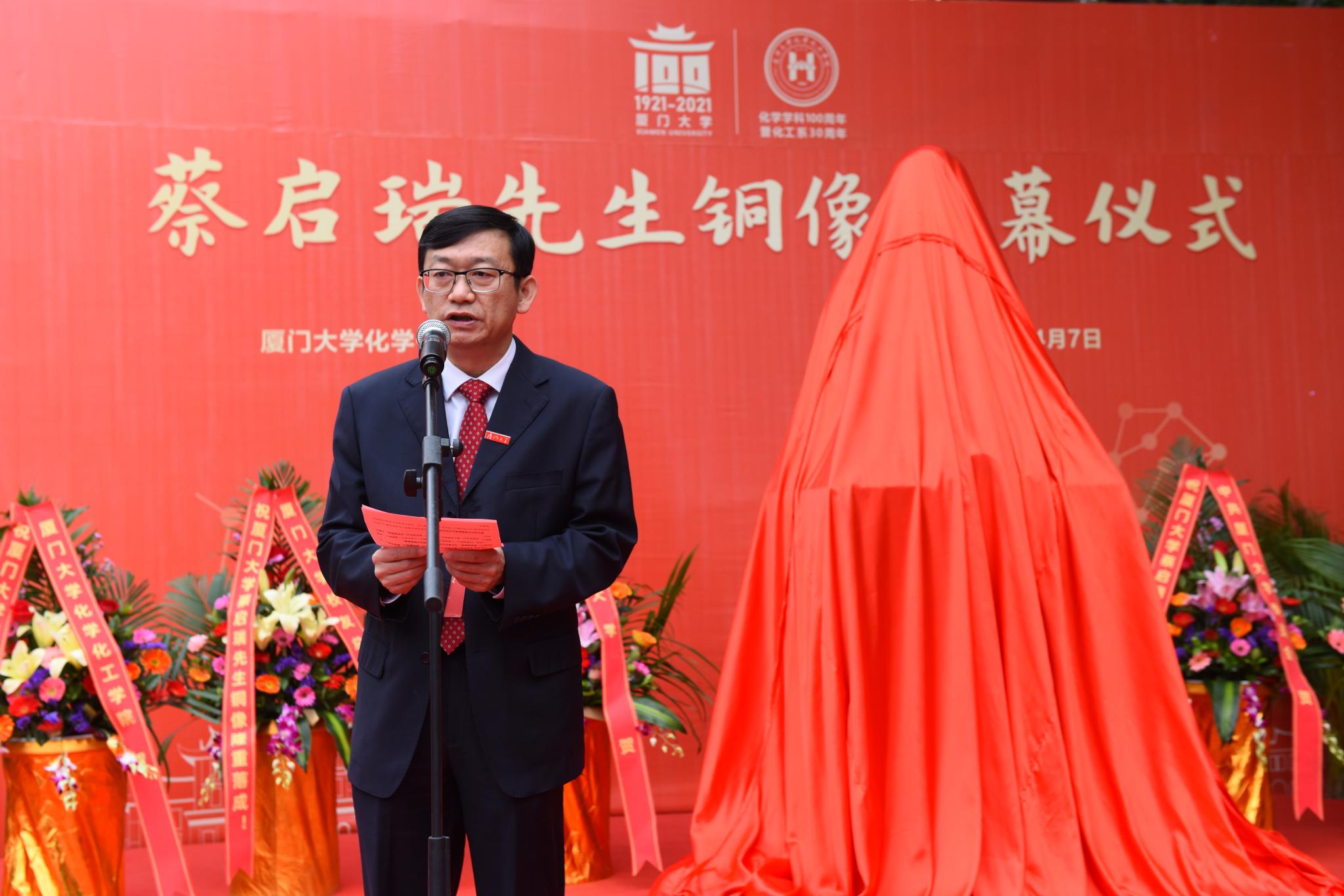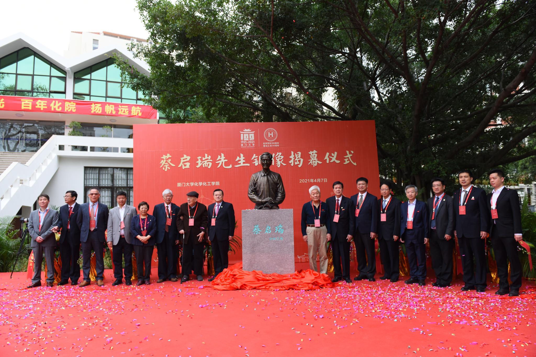 4月7日上午,在厦门大学百年华诞,厦门大学化学学科创建100周年暨化工系创办30周年,蔡启瑞先生逝世5周年之际,化学化工学院在化学报告厅广场前举行蔡启瑞先生铜像揭幕仪式。蔡启瑞先生长子蔡俊修教授及其家属,数十位中国科学院院士,校领导,海内外校友,院友会代表,社会各界朋友,学校各单位负责人,教师代表和学生代表等参加了揭幕仪式。学院党委书记宋毅主持仪式。