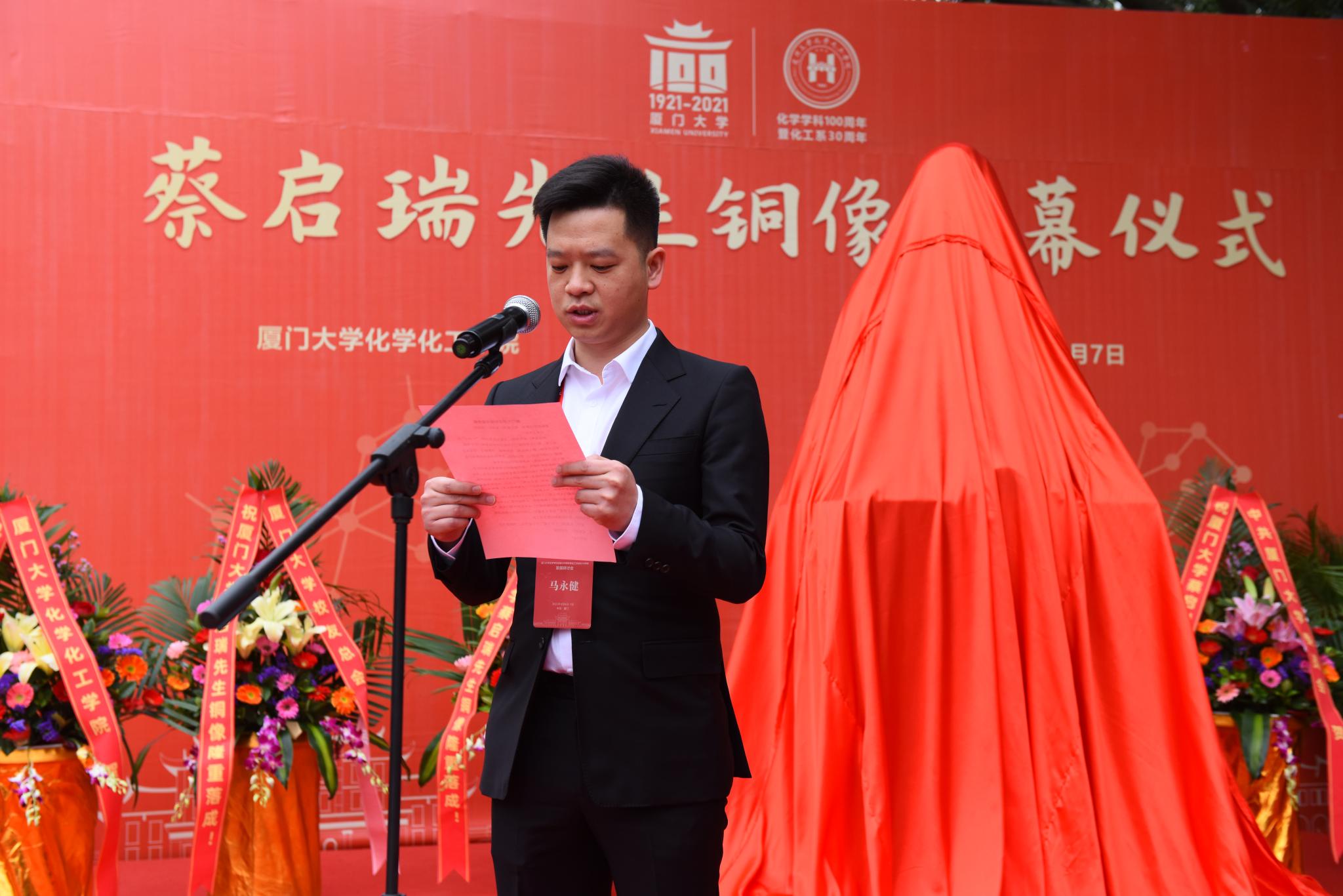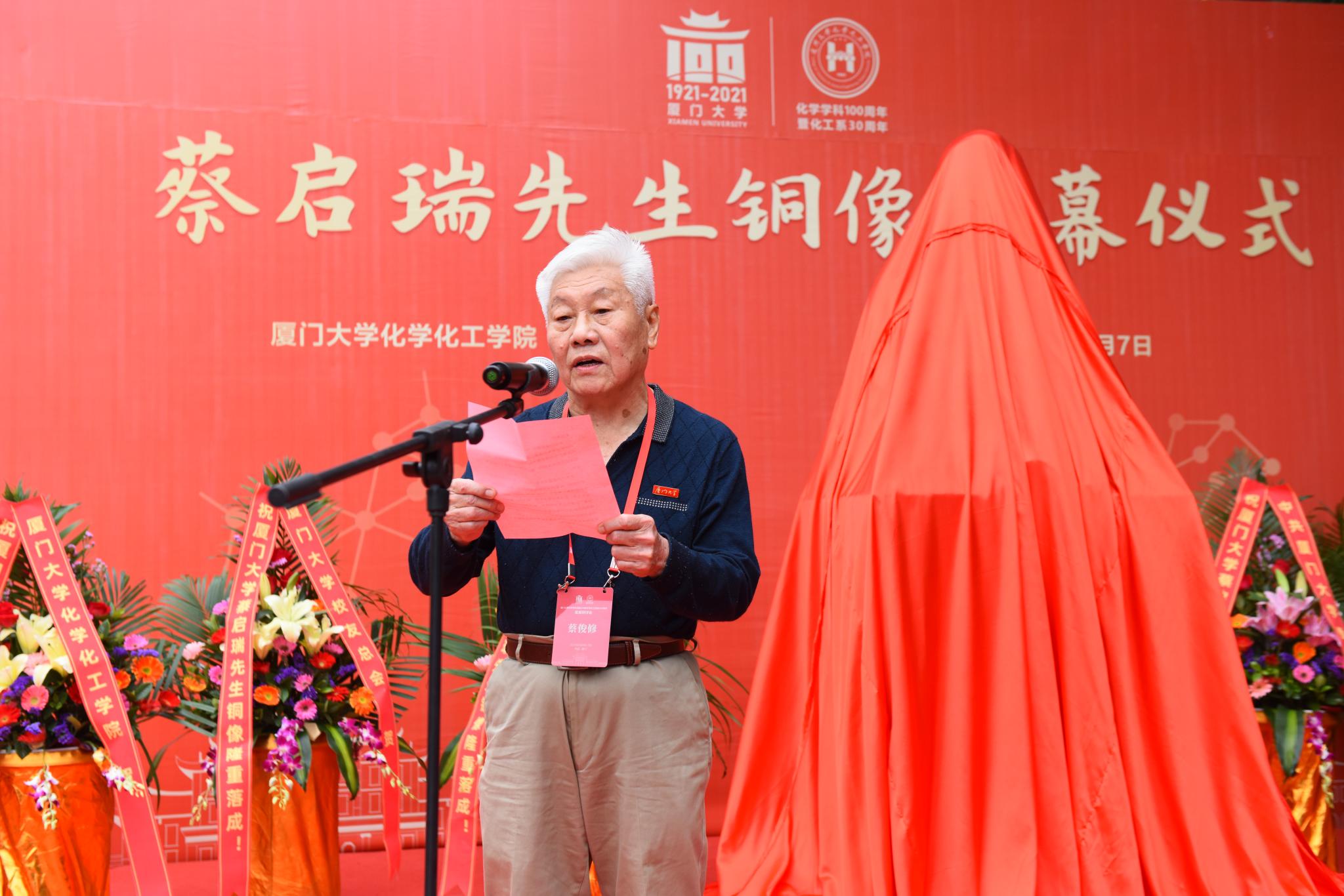 铜像捐建单位代表马永健先生在致辞中提到蔡启瑞院士为人师表,治学严谨,勇于创新,待人谦和,淡泊名利,一心为公,恪守学术规范、坚守学术诚信,为中国培养出一大批科技人才,是科学工作者的前辈和楷模,令人敬仰。在建党百年之际,“十四五”开局之年,厦门大学和厦门大学化学学科也迎来了百岁华诞。走过百年路,踏上新征程,他希望厦门大学与厦门大学化学化工学院继往开来,砥砺前行,再创辉煌!