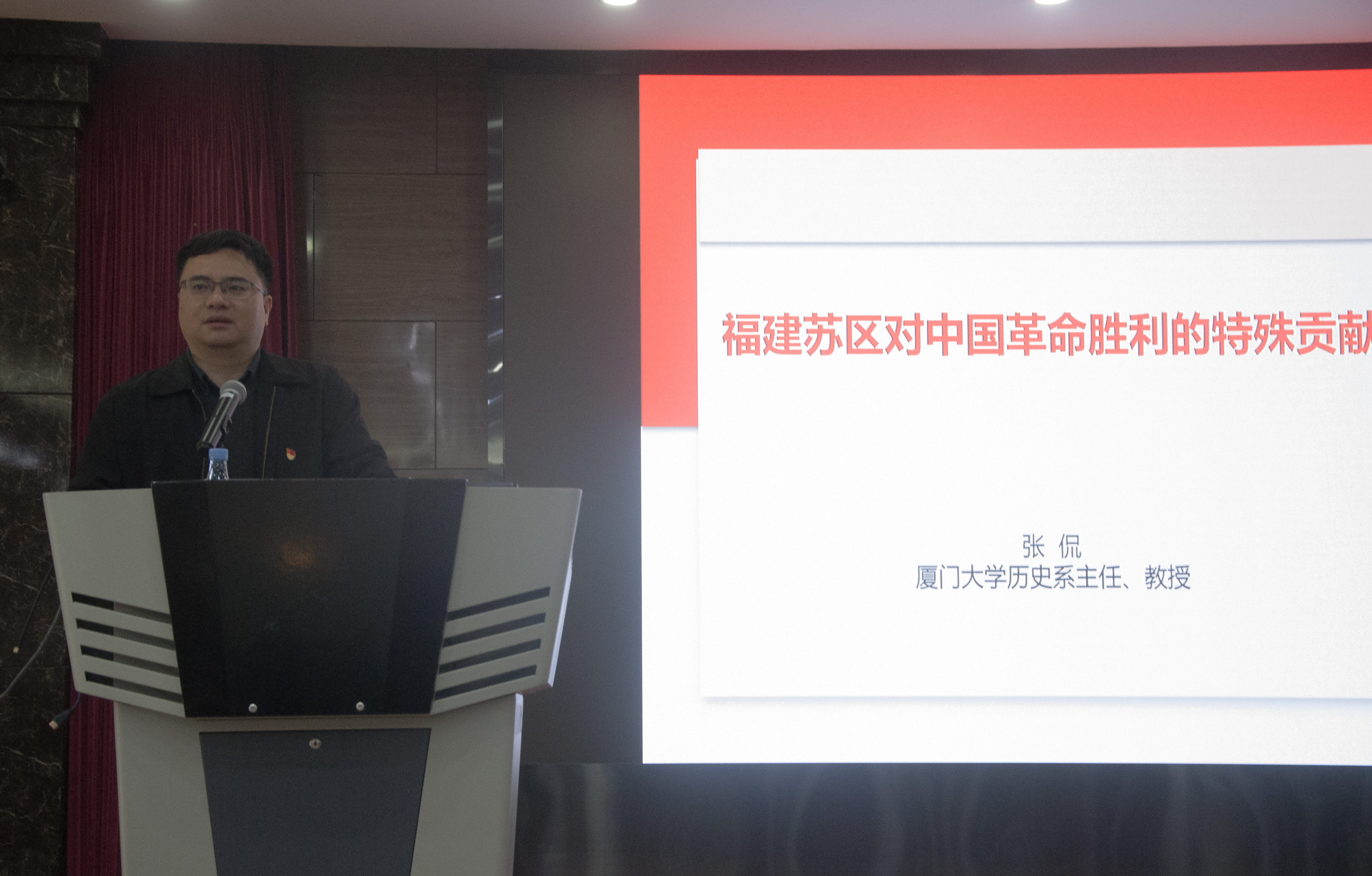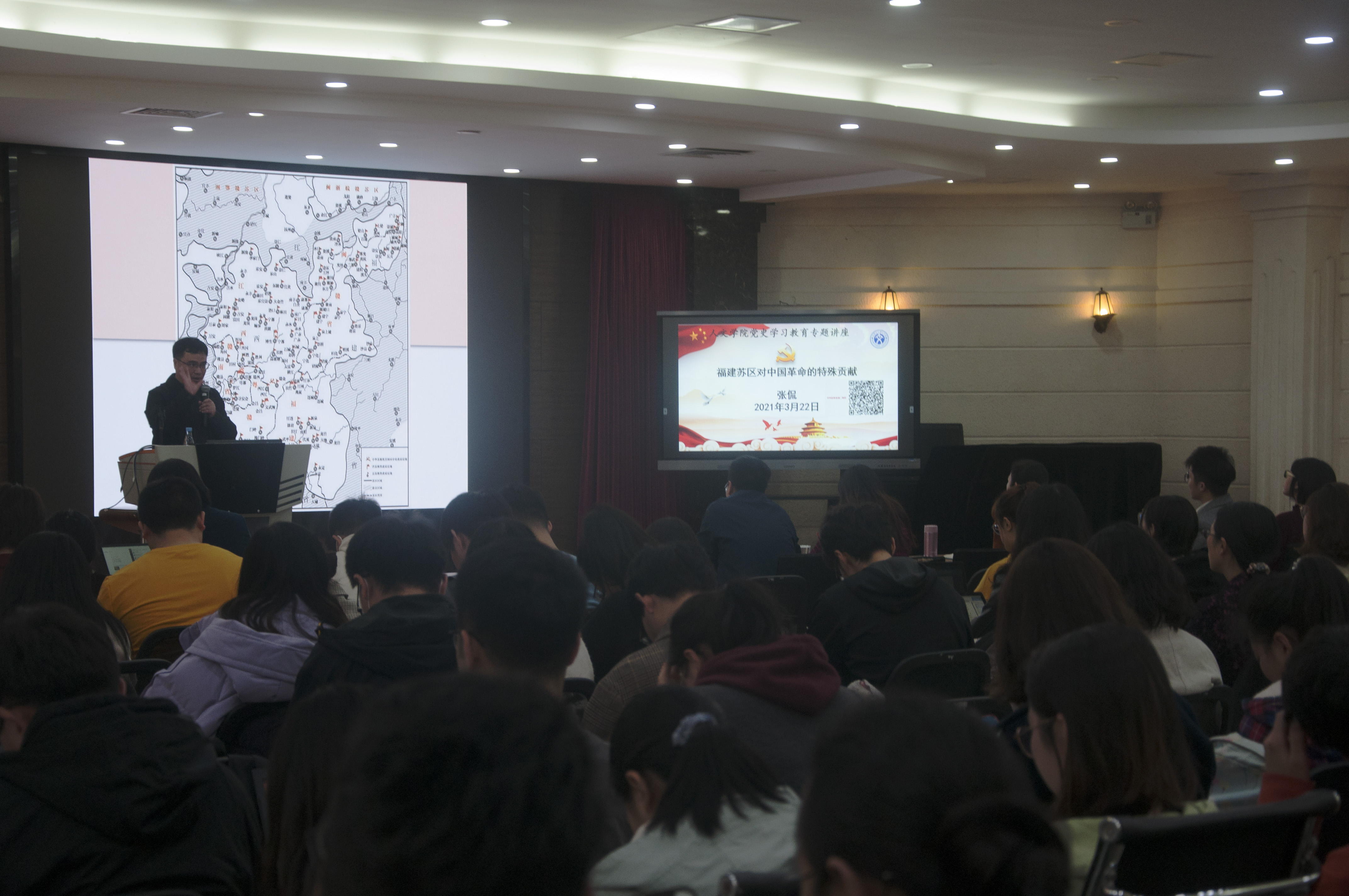 为贯彻落实习近平总书记在党史学习教育动员大会上的重要讲话精神,给学院党史学习教育开好局、起好步,3月22日下午,人文学院在联兴楼多功能厅举办党史学习教育专题讲座第一讲。讲座邀请校党委宣传部理论报告员、历史系主任张侃教授为全体学生党员作题为《福建苏区对中国革命胜利的特殊贡献》的报告,人文学院团委书记王旖旎主持讲座。