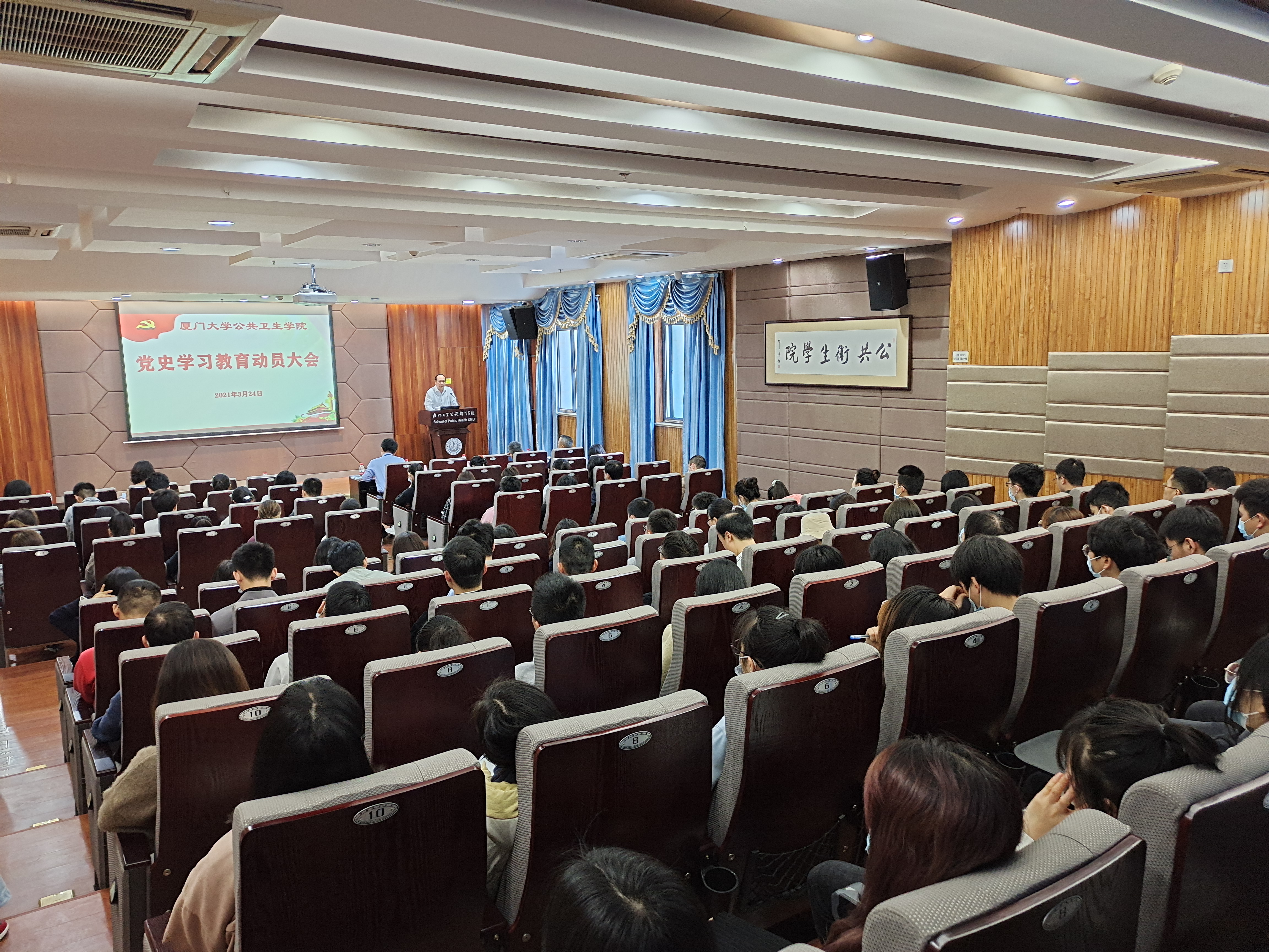 学院党委书记张琥作动员讲话。张琥传达了校党委书记张彦在学校党史学习教育动员大会上的讲话精神。他强调,开展党史学习教育是当前一项重要政治任务,要提高站位,统一思想,深刻认识在建党一百周年之际开展党史学习教育的重要意义;要加强领导,务求实效,精心组织主题突出、特色鲜明、形式多样的学习活动,贯彻落实好学校党史学习教育各项工作要求。他表示,厦大公卫人始终与党同心同行,秉持“为党育人、为国育才”的初心使命,为我国公共卫生教育事业和人才培养发挥积极作用。在建党百年和建校百年历史交汇的关键节点,立足新起点、新征程,守正创新,实干担当,坚持学史明理、学史增信、学史崇德、学史力行,将党史学习教育与建设高水平公共卫生学院目标相统一,扎实推进学院各项工作高质量发展,以实际成效体现学习教育效果,为支持“健康中国”发展战略实施和学校“双一流”建设作出厦大公卫人应有之贡献。